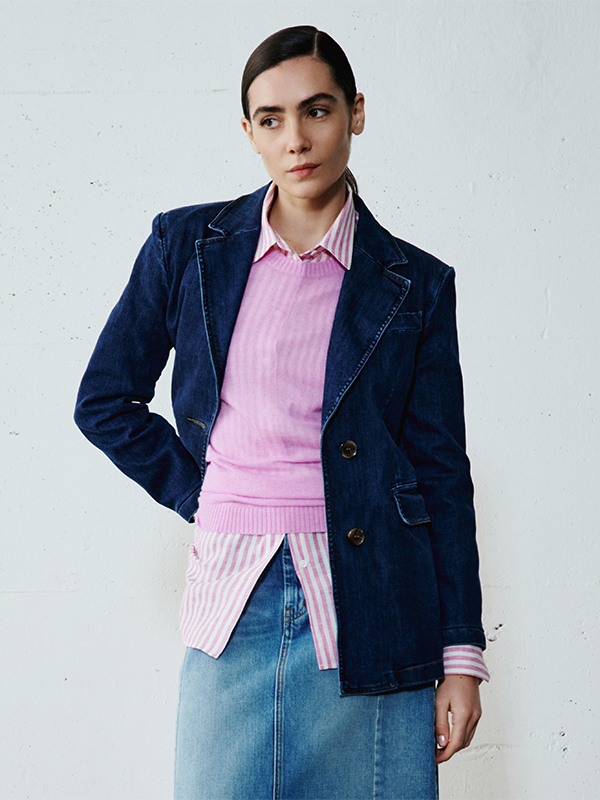 Discover the contrast between the palest wash and deep blue, with boxy jackets and midi skirts featuring a front slit. Layering and texture for a bold look.