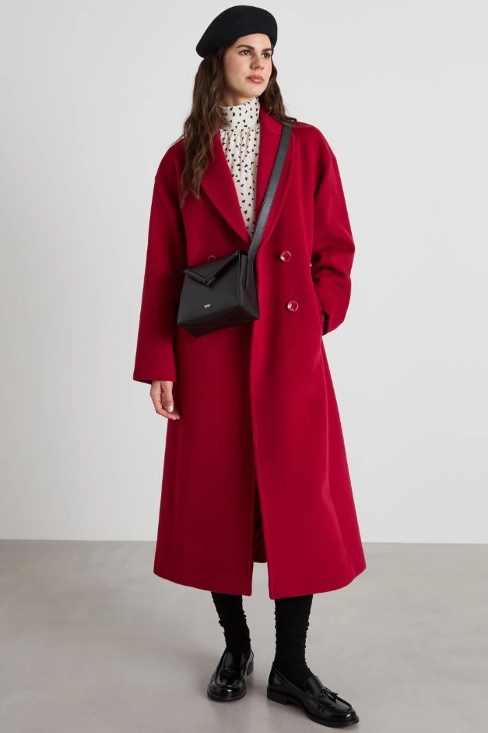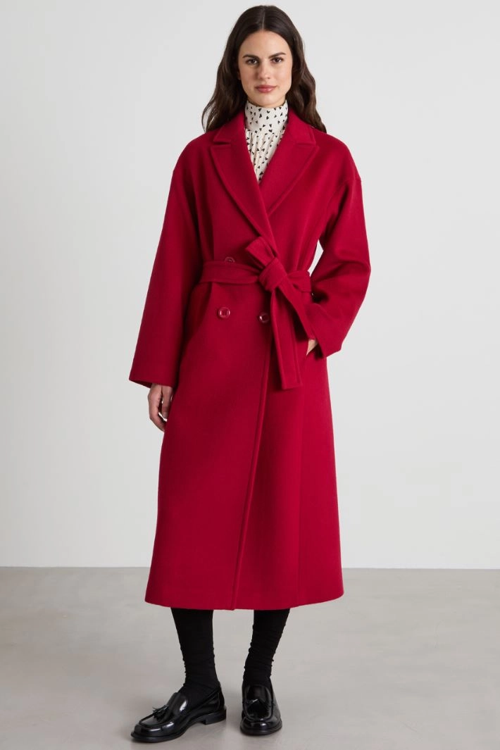 Long, loose fit coat in pure wool drap, with a peak lapel collar, long dropped sleeves and inset side pockets. Central slit on the back and double-breasted fastening with buttons. Matching belt. Lined.