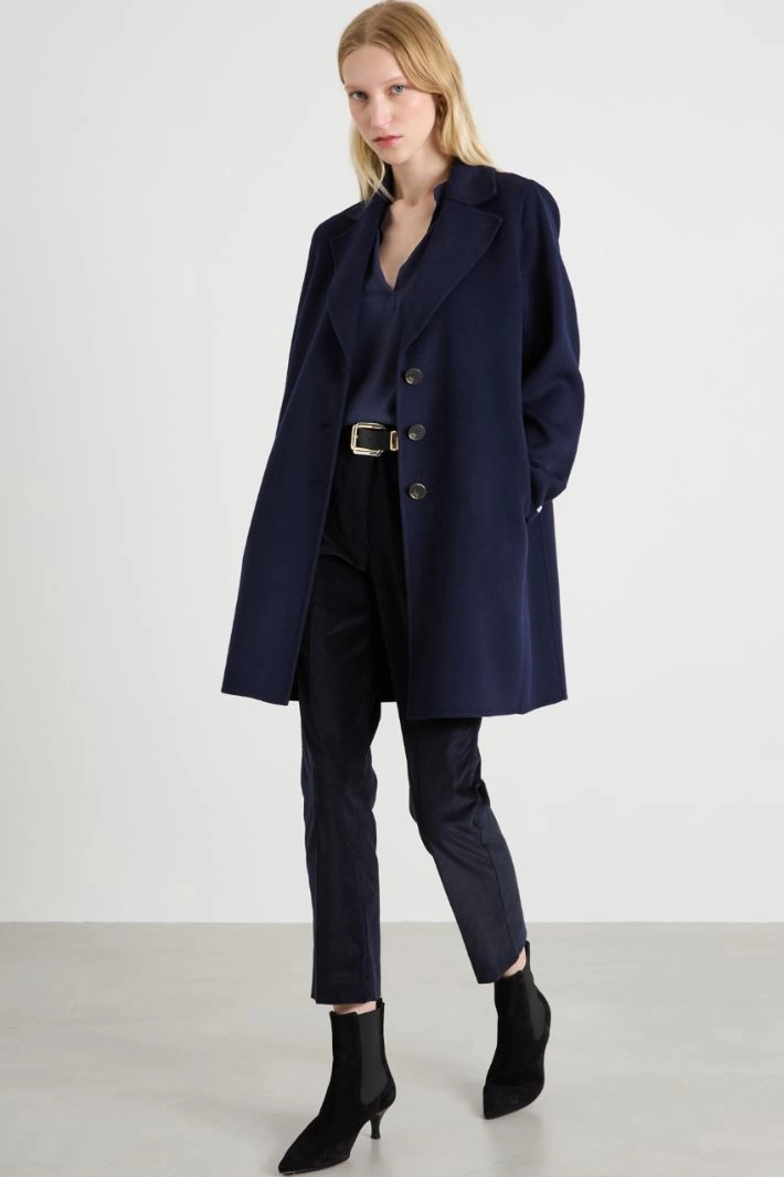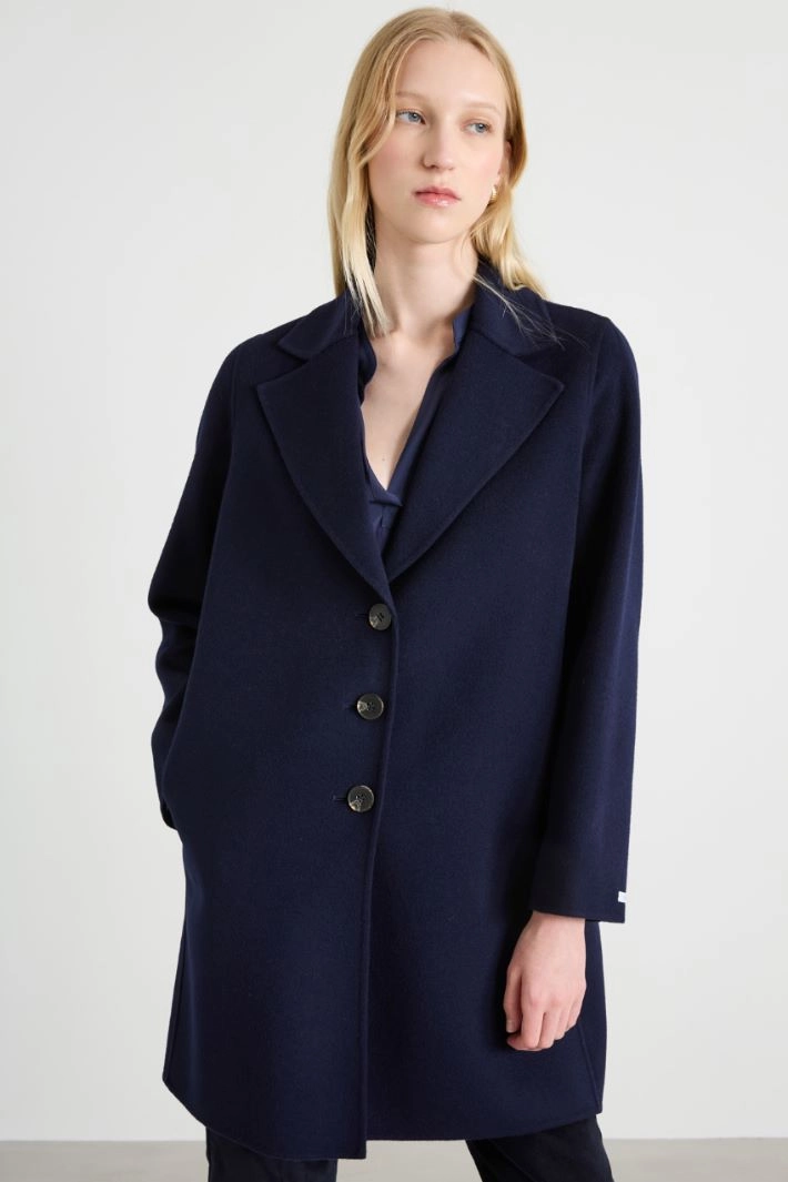 Straight-cut coat in double wool and viscose fabric, with lapel collar, long sleeves, inset side pockets and single-breasted fastening with buttons. Unlined.