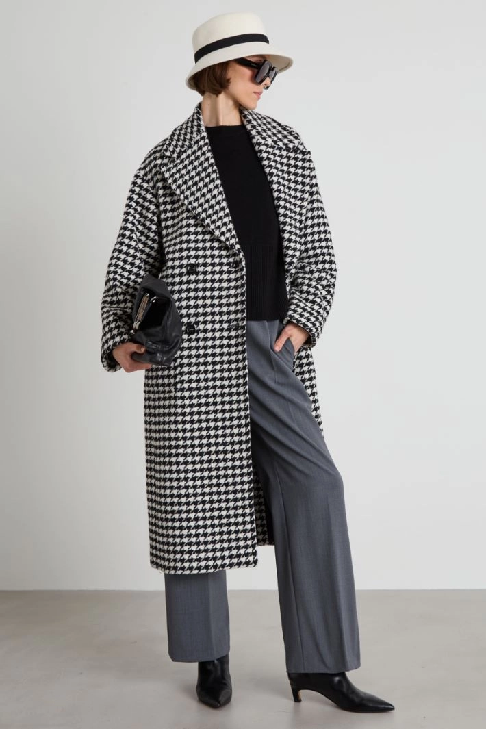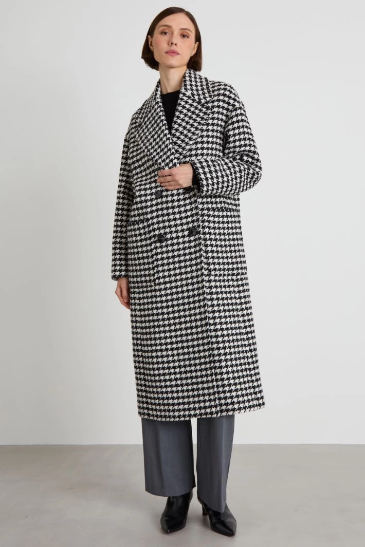 Long straight-fit coat in yarn-dyed wool blend woven fabric, with lapel collar, long sleeves and side patch pockets. Central slit on the back and double-breasted fastening with buttons. Lined.