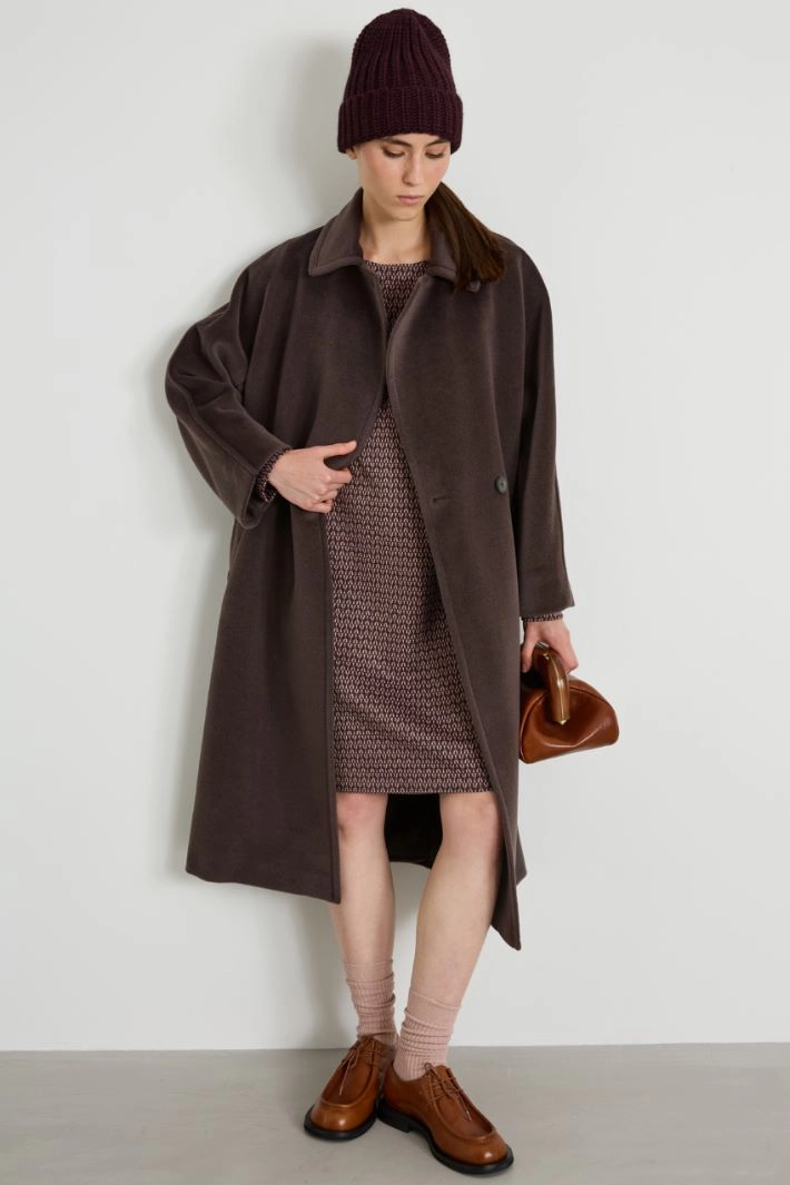 Straight-fit coat in pure wool beaver with a topstitching, lapel collar, long sleeves, welt pockets and a central vent on the back. Double-breasted fastening with buttons. Matching belt. Lined.