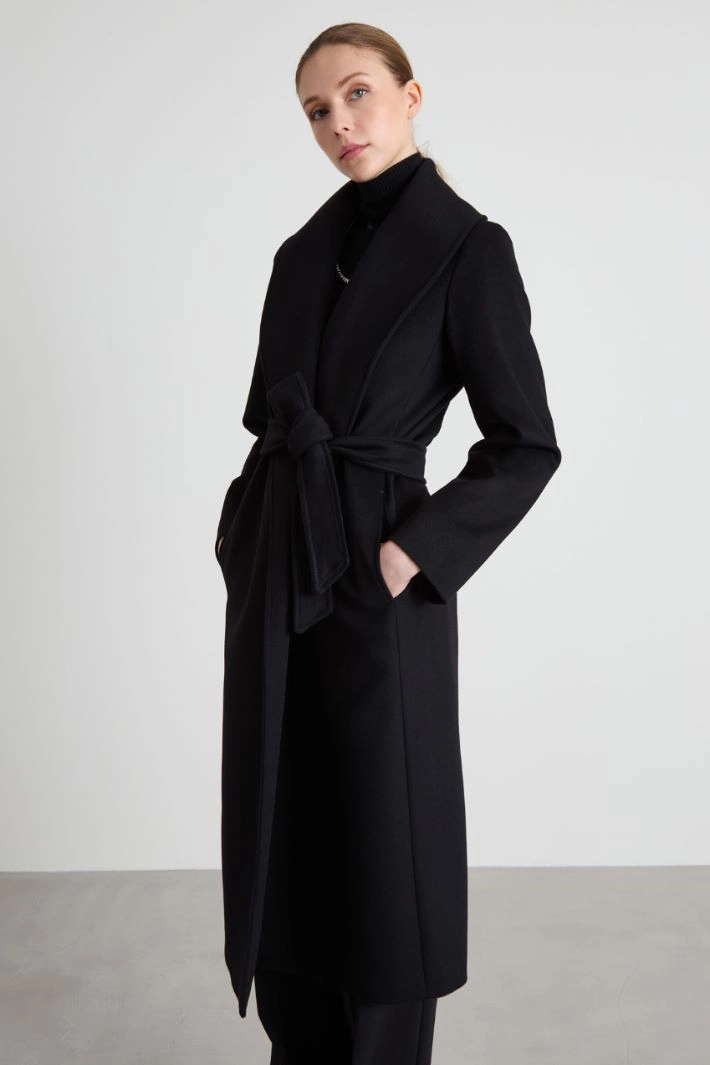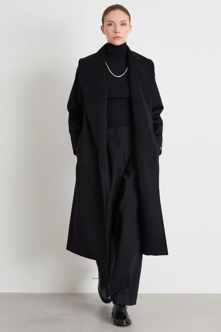 Long straight-fit coat in pure wool drap, with wide shawl collar, long sleeves, inset side pockets and central slit on the back. Fastening with a coordinated belt. Lined.