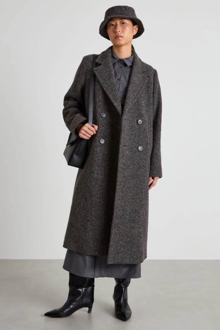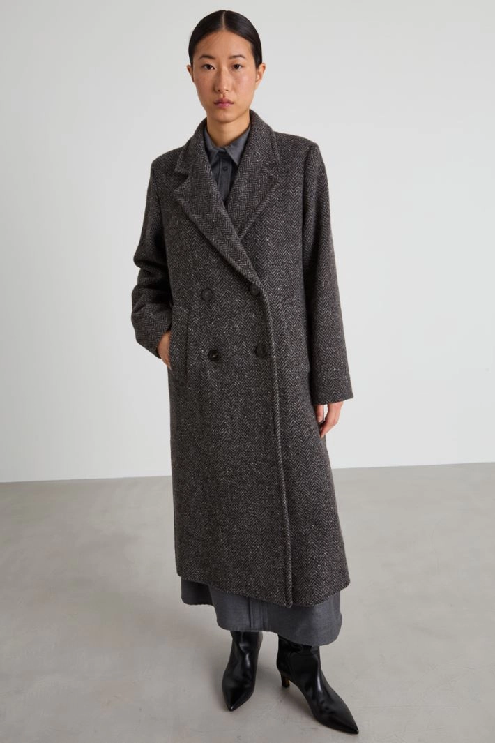 Long straight-fit coat in yarn-dyed wool tweed, with lapel collar, long sleeves, side welt pockets and central vent on the back. Double-breasted fastening with buttons. Lined garment.
