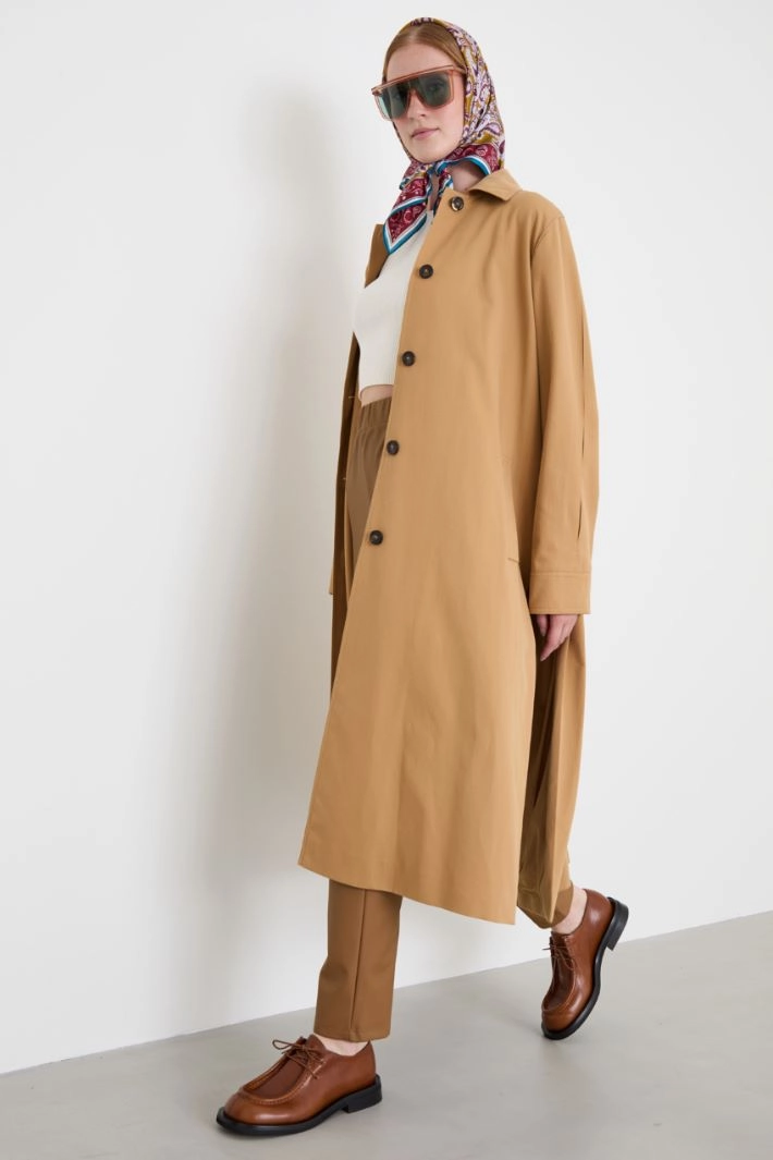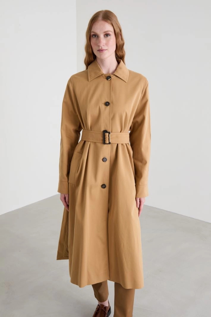 Single-breasted flared trench coat in pure cotton water -resistant gabardine, with a shirt collar, long sleeves with a counter-pleat detail, side welt pockets and wide side slits. Fastening with buttons and a matching belt. Lined.
