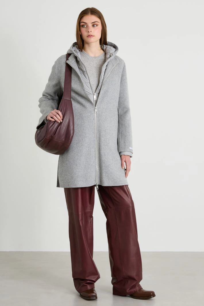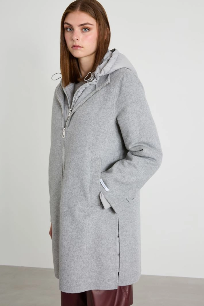 Coat and padded with a straight cut in double wool and viscose, with a high collar, long sleeves with adjustable toggles, welt pockets on the front, side slits and zip fastening. Padded jacket in technical fabric, with a hooded collar, long sleeves, patch pockets and zip fastening.