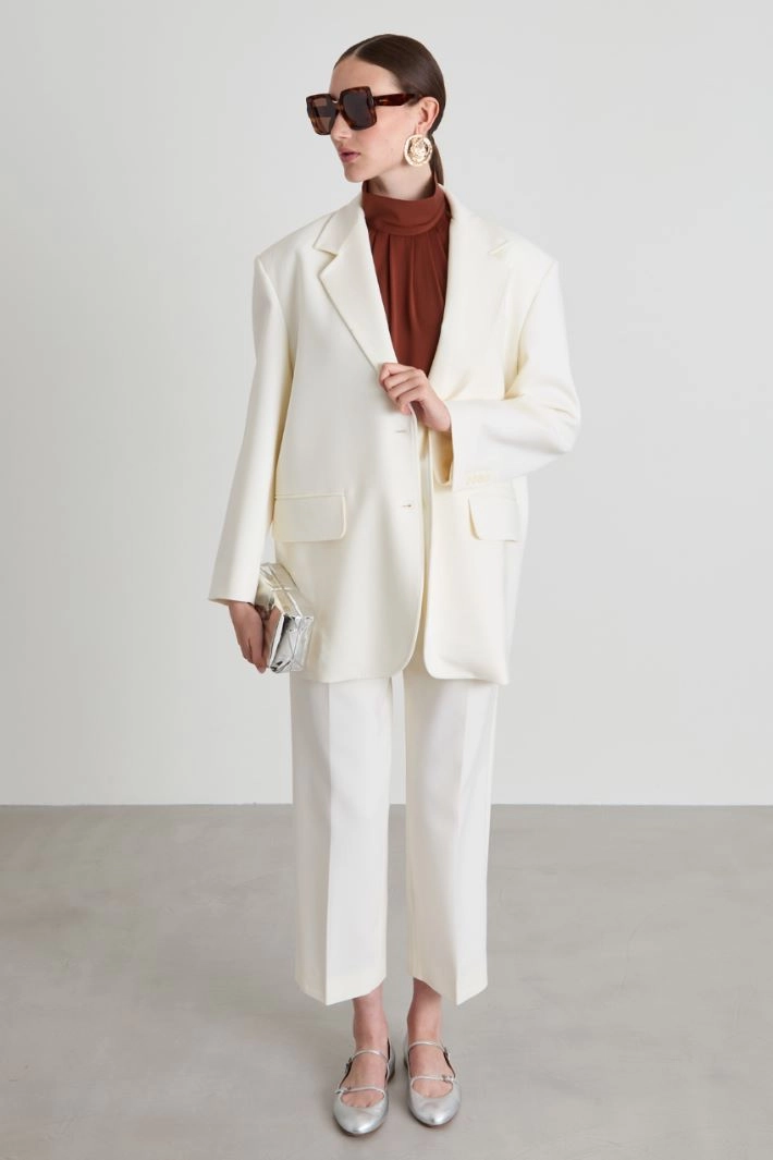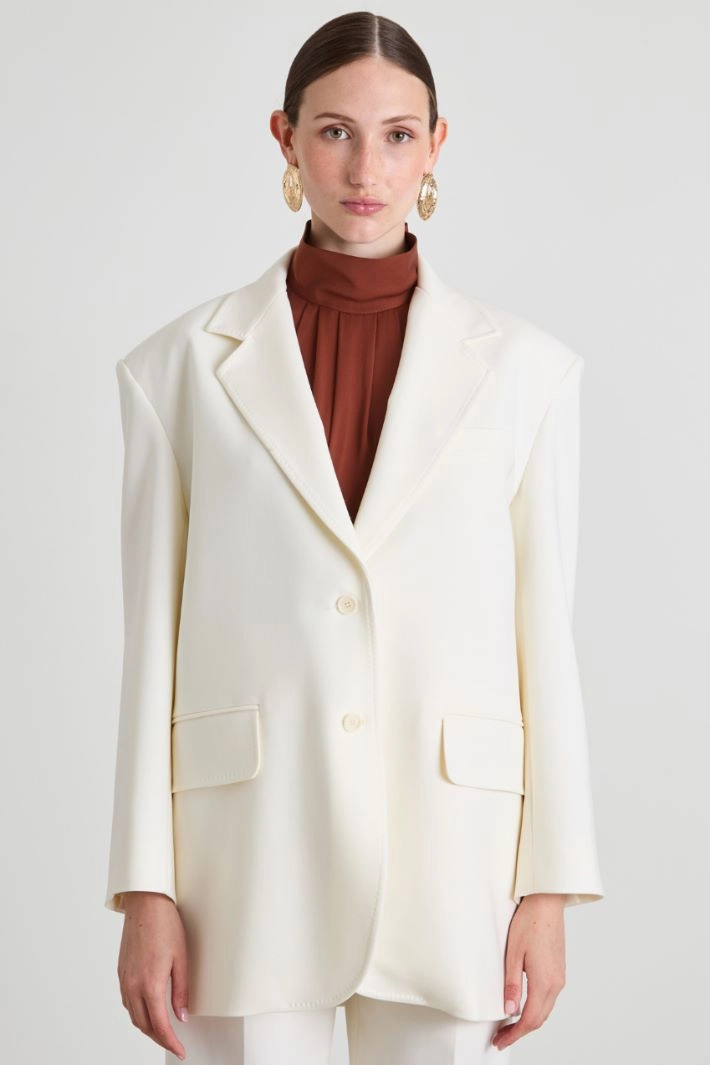 Oversized blazer in double stretch wool crepe, with topstitching lapel collar, long sleeves with buttons, breast pocket and double welt side pockets with flap. Single-breasted button fastening. Lined.