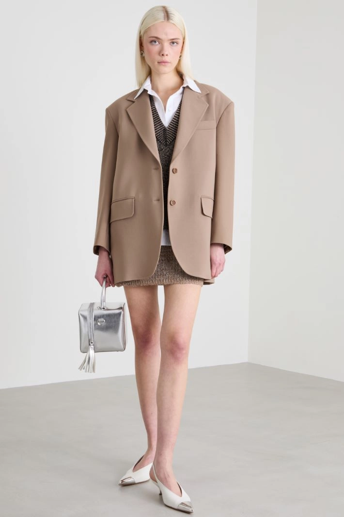 Oversized blazer in double stretch wool crepe, with topstitching lapel collar, long sleeves with buttons, breast pocket and double welt side pockets with flap. Single-breasted button fastening. Lined.