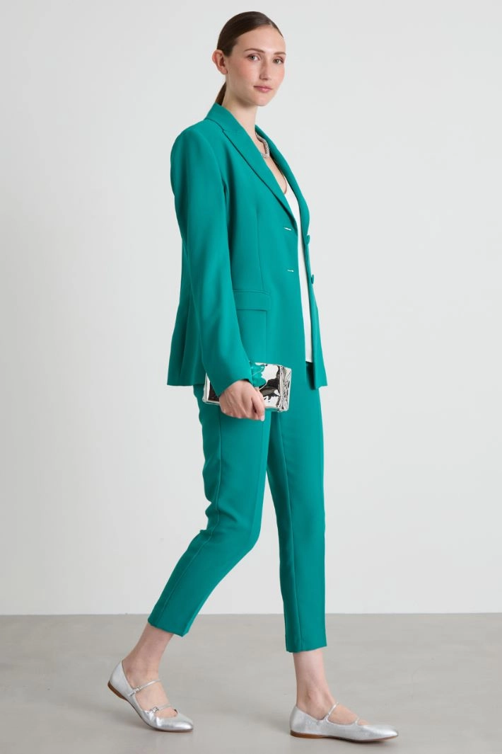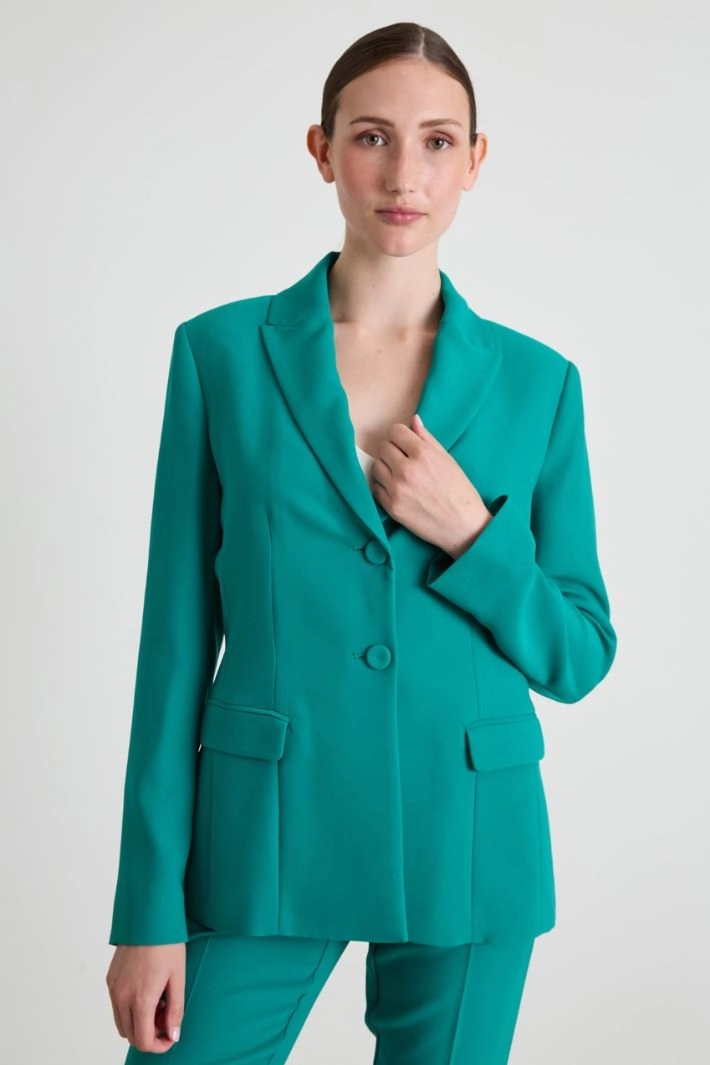 Fitted envers satin blazer with peak lapel collar, long sleeves, double-welt side pockets with flap and single-breasted fastening with covered buttons. Lined.