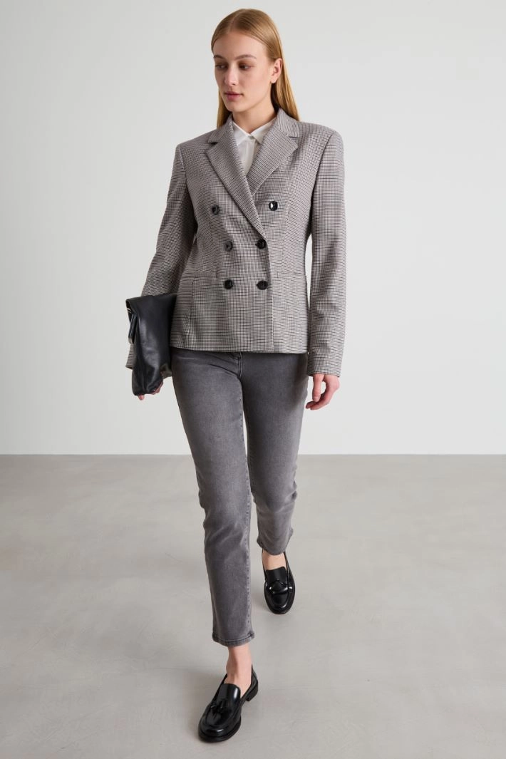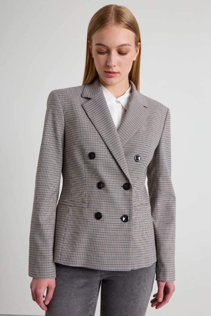 Fitted blazer in viscose blend twill, with lapel collar, long sleeves with slit and welt pockets. Double-breasted fastening with buttons. Lined.