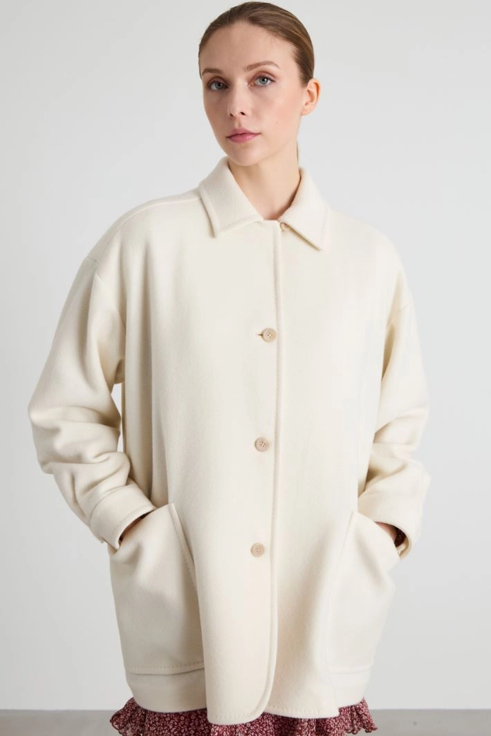 Straight-fit shirt-style coat in double alpaca, cashmere and camel, with a classic collar, long dropped-neck sleeves with cuff and button, side patch pockets and single-breasted button fastening. Semi-lined.