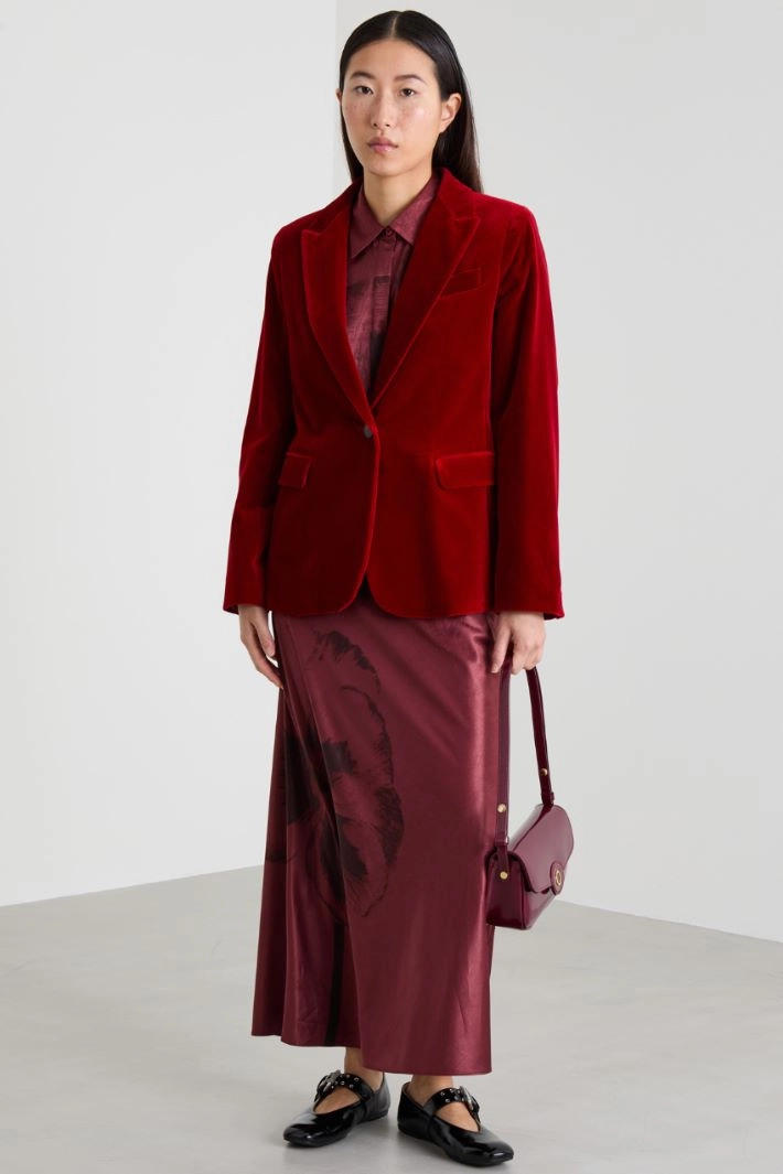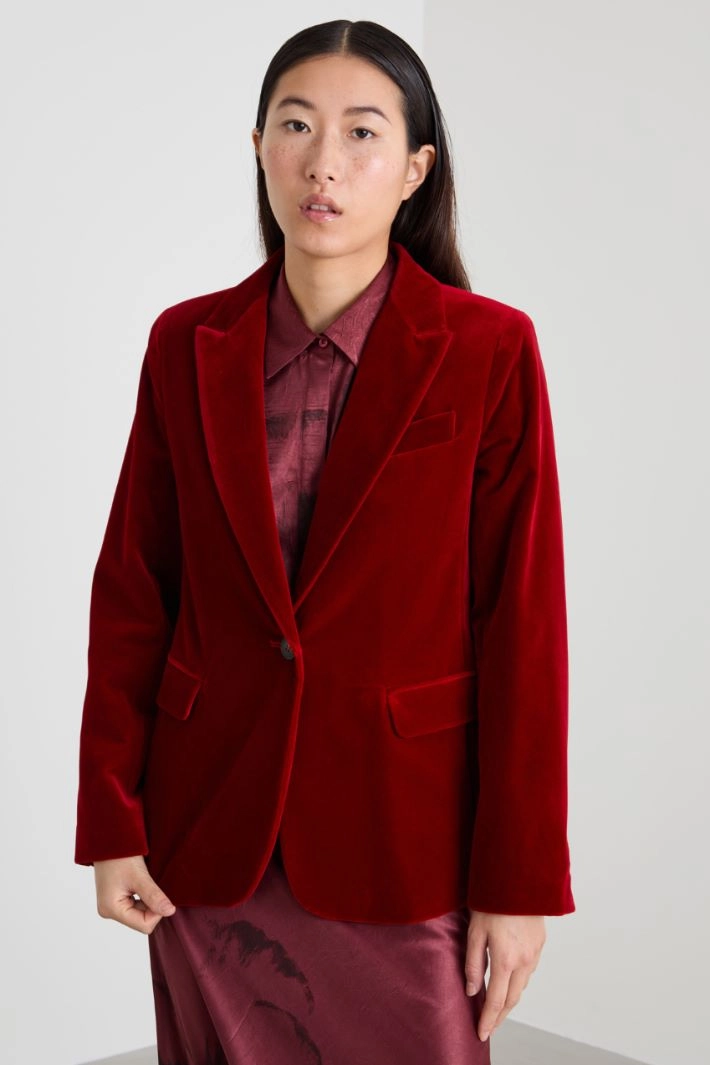 Slightly fitted blazer in stretch cotton velvet, with lapel collar, long sleeves with buttons at the bottom, double welt pockets with flap and central vent at the back. Single-breasted button fastening. Lined.