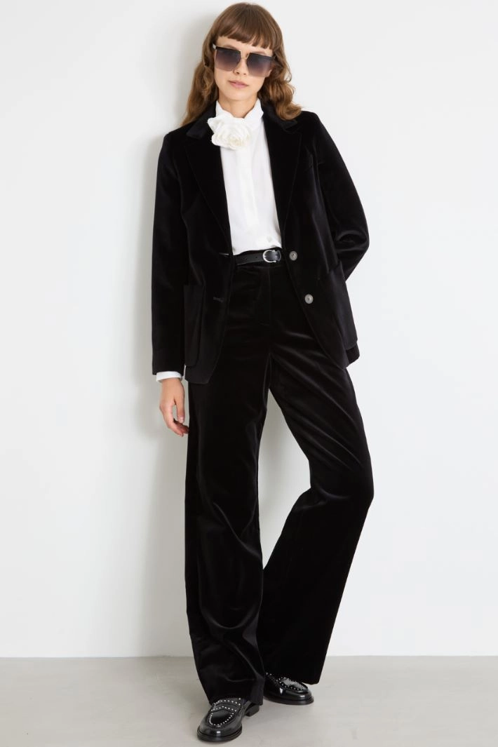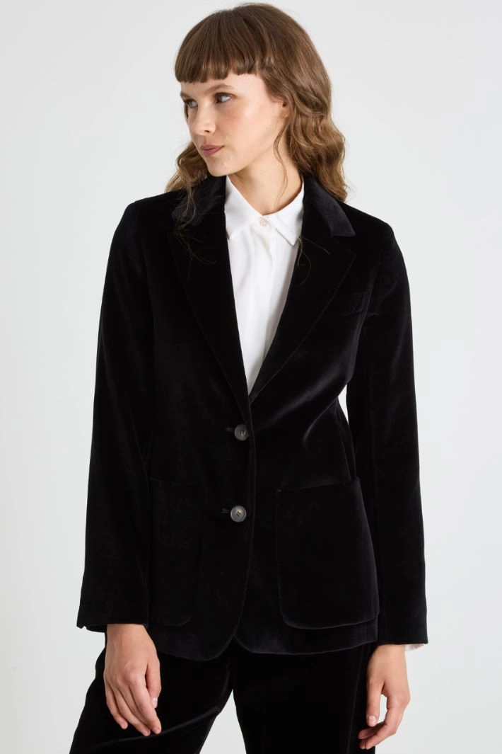 Straight-fit blazer crafted from smooth pure cotton velvet, featuring a lapel collar, long buttoned sleeves, a welt chest pocket, large front patch pockets, a back vent, and a single-breasted button closure. Lined.