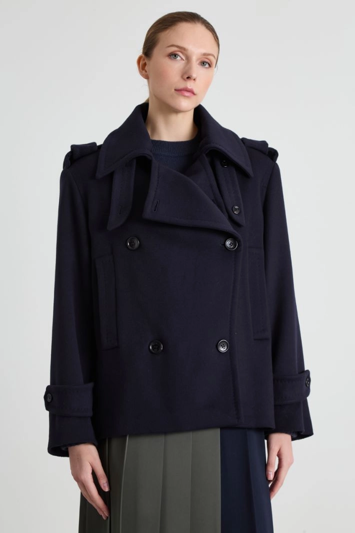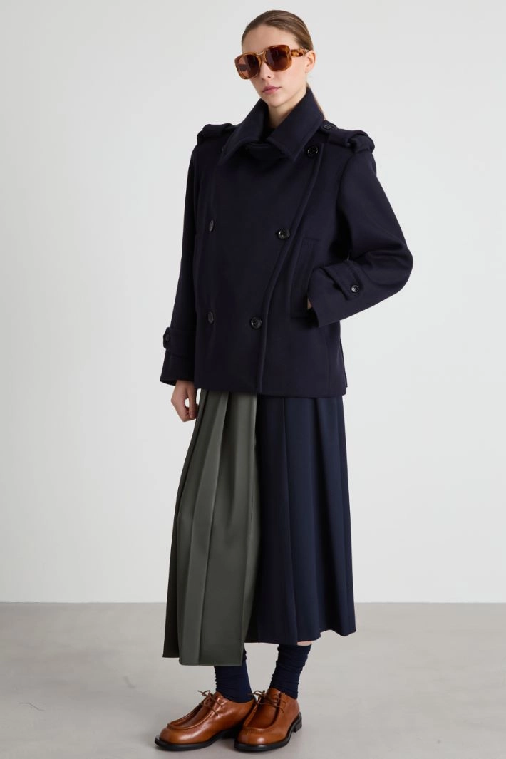 Straight-fit pea coat in double wool and cashmere drap, with matching trim, shirt collar with strap, maxi toggles on the shoulders, long sleeves with strap at the wrist and side welt pockets. Side slits on the back and double-breasted fastening with buttons. Lined.