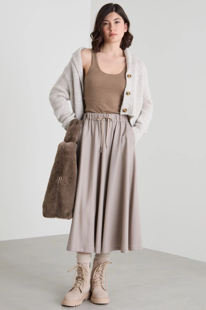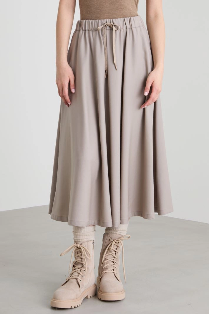 Flared midi skirt in pure wool canvas, with elastic insert and drawstring at the waist, and French pockets on the front.