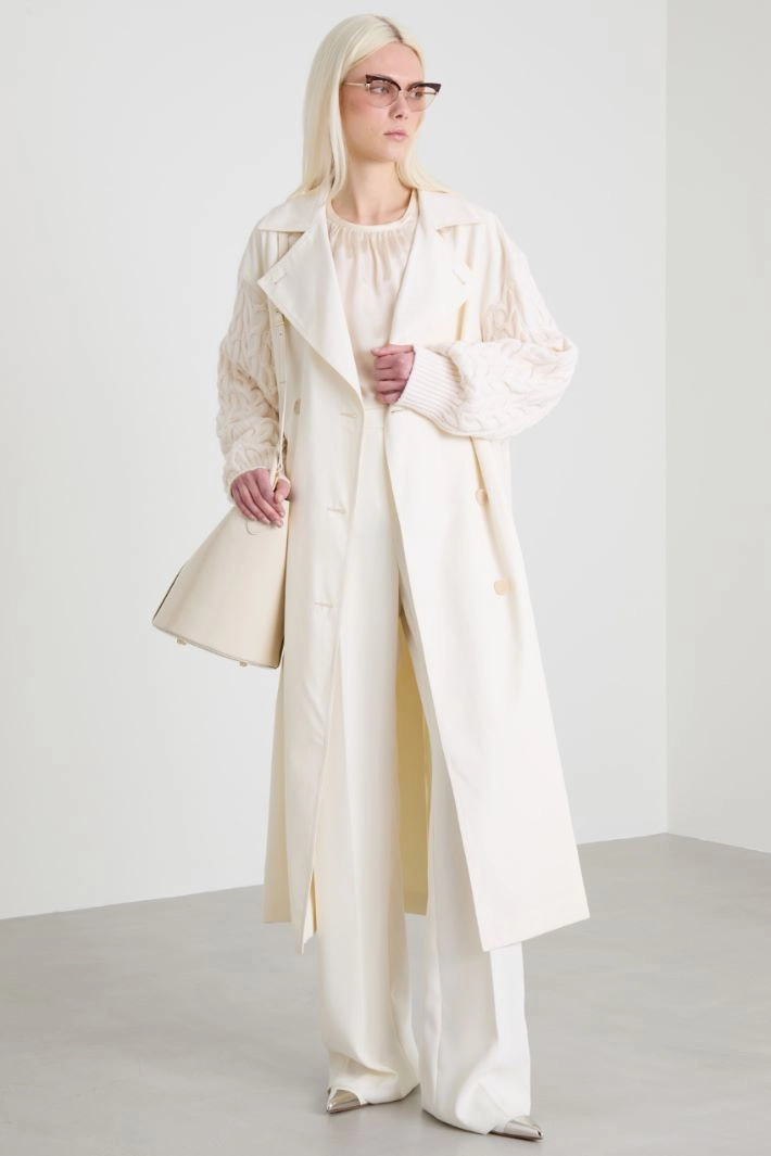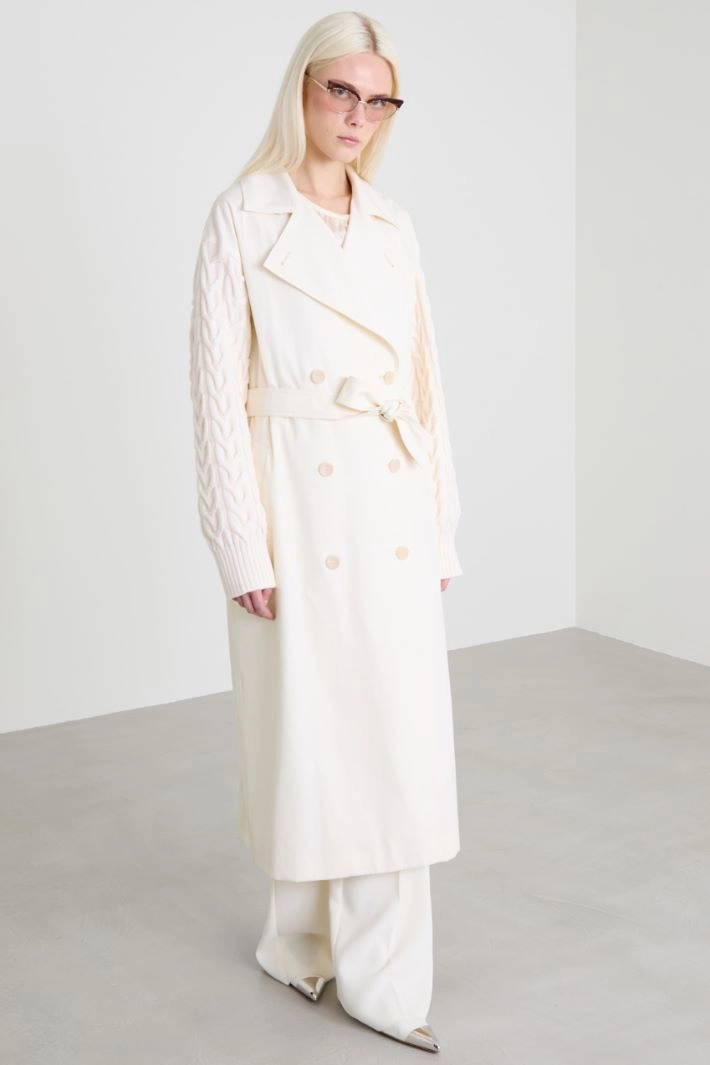 Regular-fit trench coat in water-repellent wool and cotton gabardine, with long sleeves in pure wool cable knit, lapel collar, welt pockets on the sides, cape on the back and central vent on the back. Double-breasted fastening with buttons. Matching belt. Lined.