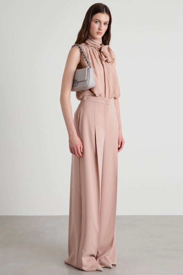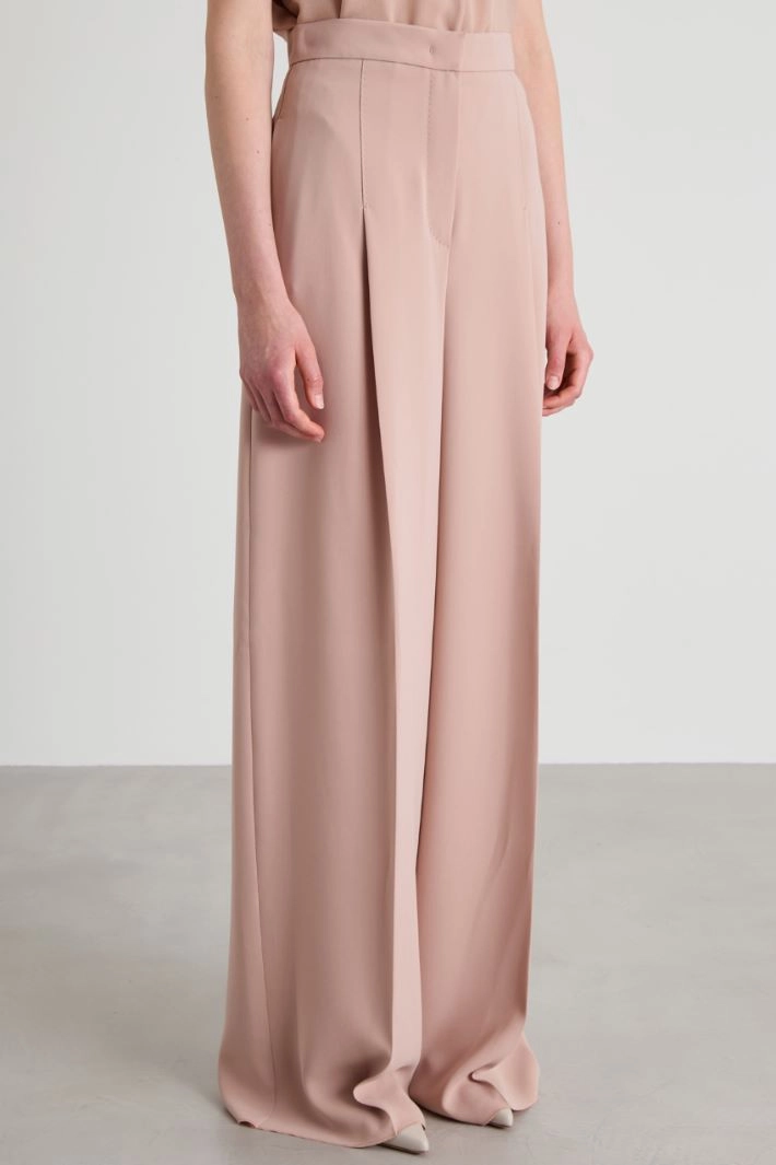 High-waisted trousers with wide legs in compact cady, with darts at the waist, French pockets on the sides and pressed crease along the length. Concealed fastening with zip, button and hook.