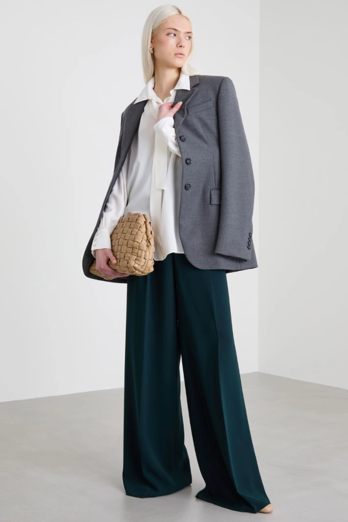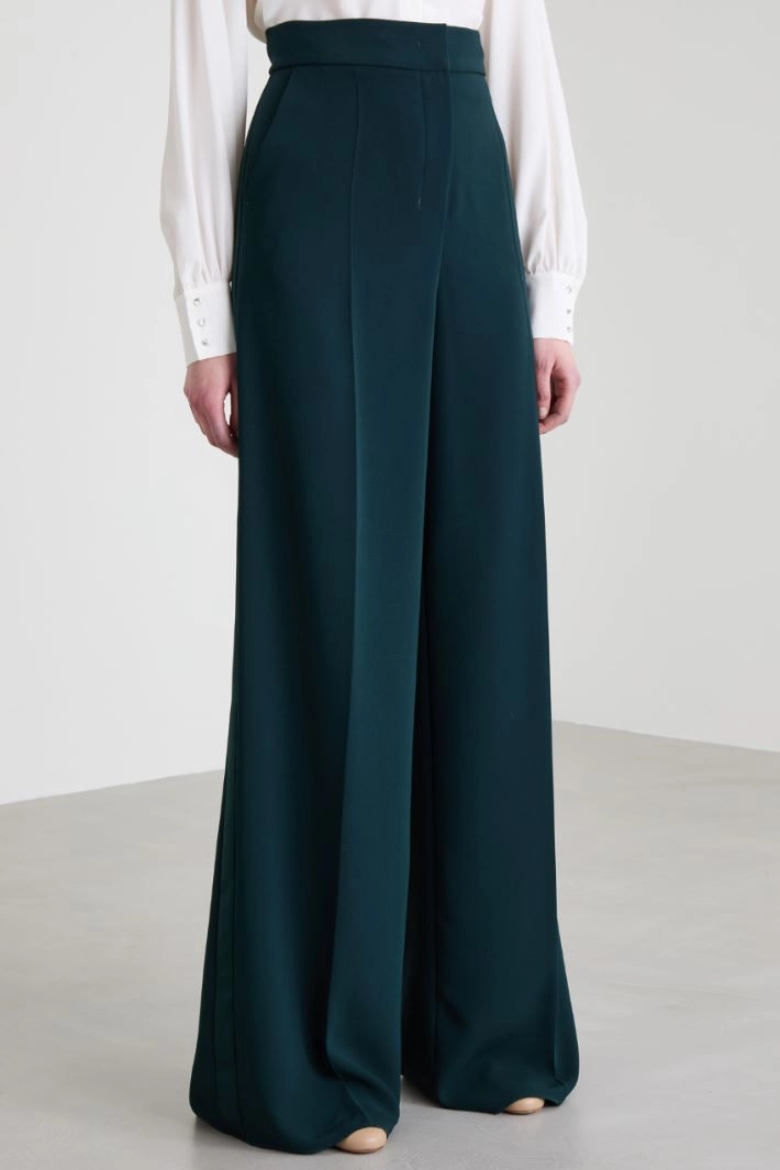 Cady palazzo tuxedo trousers with a satin side band, French side pockets, welt pockets on the back, pressed crease. Hidden fastening with zip, button and hooks.