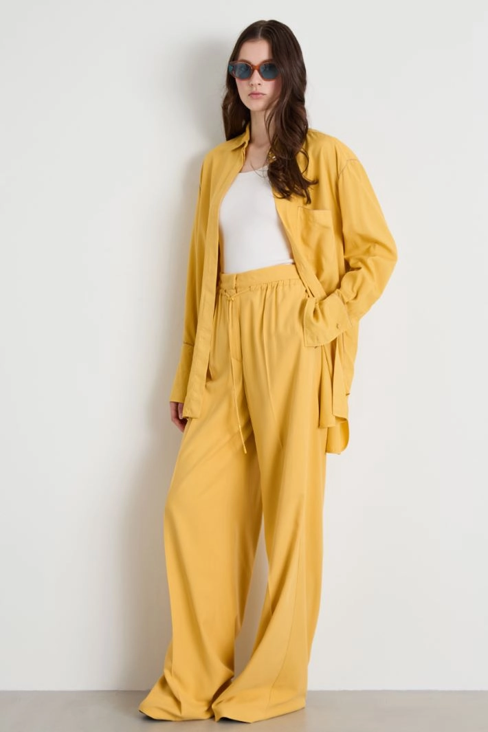 Straight-fit fluid trousers in pure silk washed canvas, with drawstring waist, French pockets and pressed crease lengthwise. Hidden fastening with zip, button and hook.