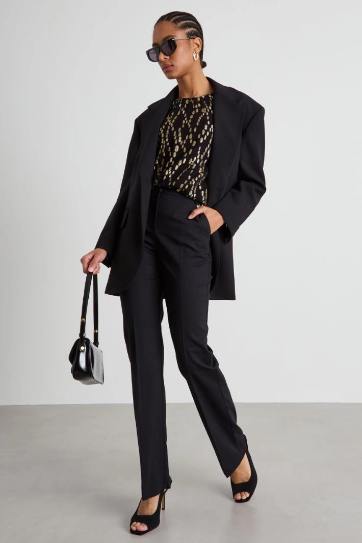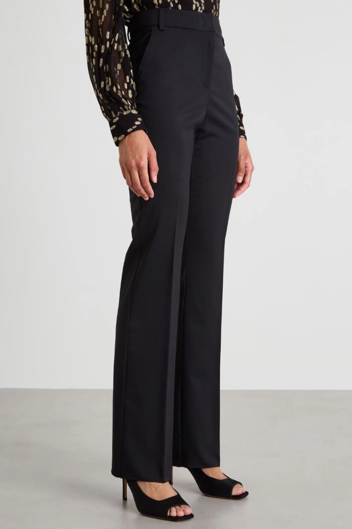 Straight-fit trousers in stretch wool twill, with belt loops, French pockets at the front, welt pockets at the back and crease pressed along the length. Hidden fastening with zip, button and hooks.