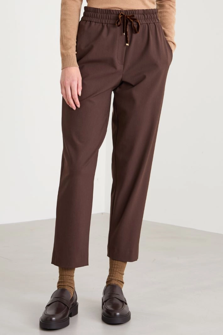 Baggy trousers in stretch viscose blend canvas, with elastic insert and drawstring waist, inset pockets on the front and welt pockets on the back.