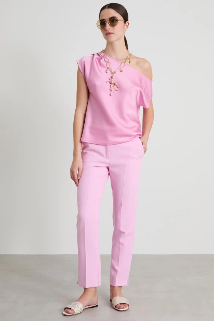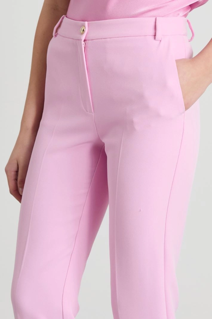Canvas cigarette trousers with belt loops at the waist, French pockets on the front, pressed crease lengthwise and slits on the ankle. Fastening with hidden zip and metal button.