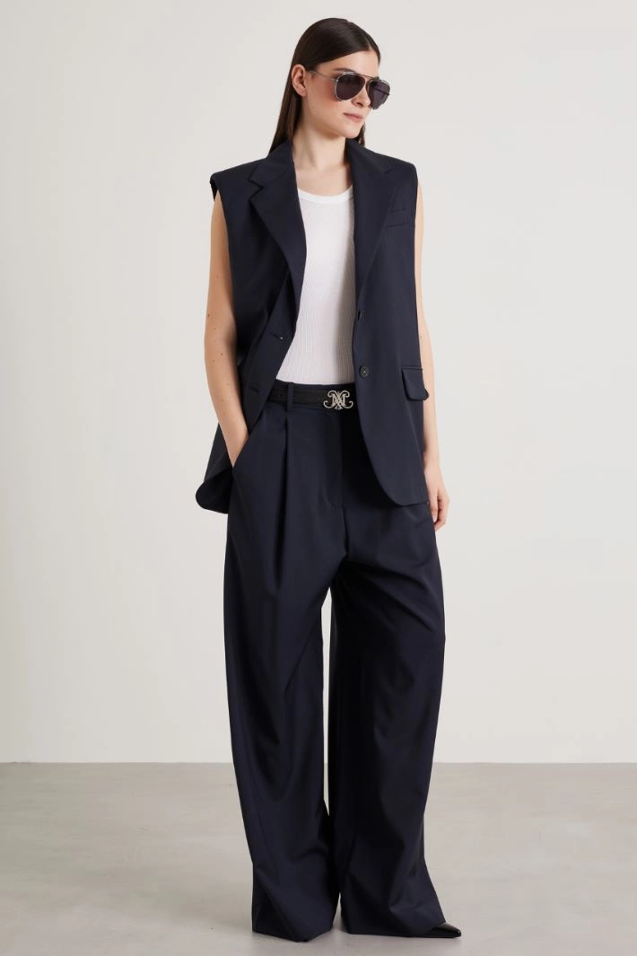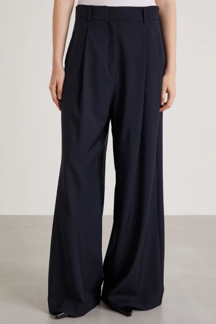 Palazzo trousers in pure wool canvas with belt loops, pleats, French pockets in front and buttoned welt in the back. Hidden fastening with zip, button and hooks.