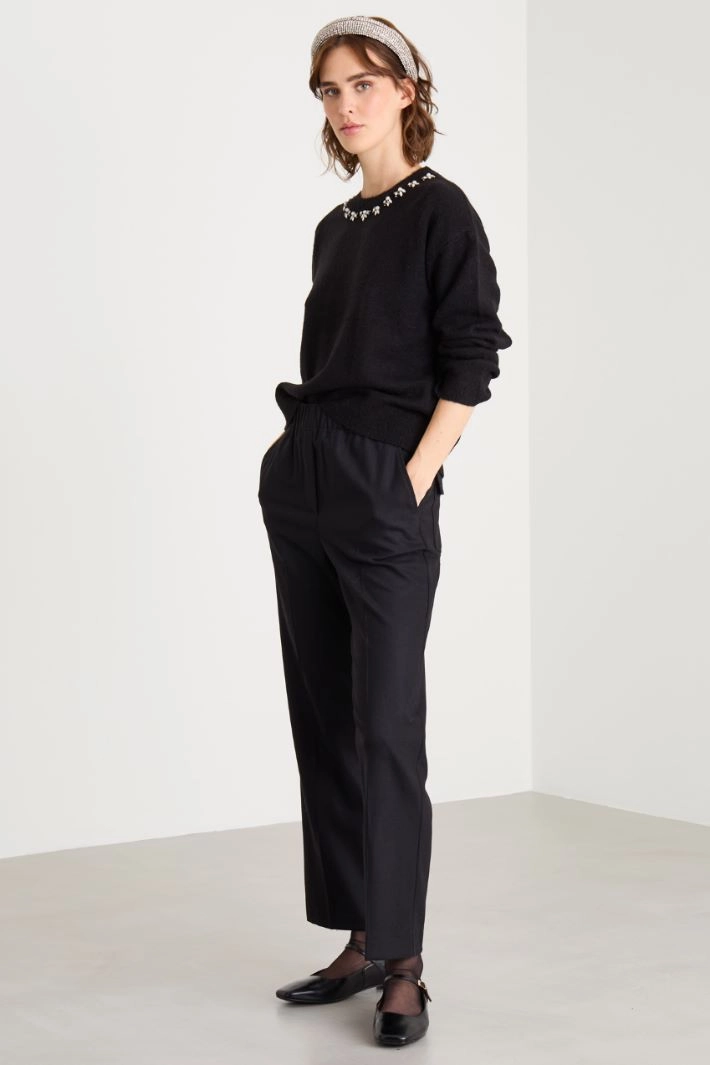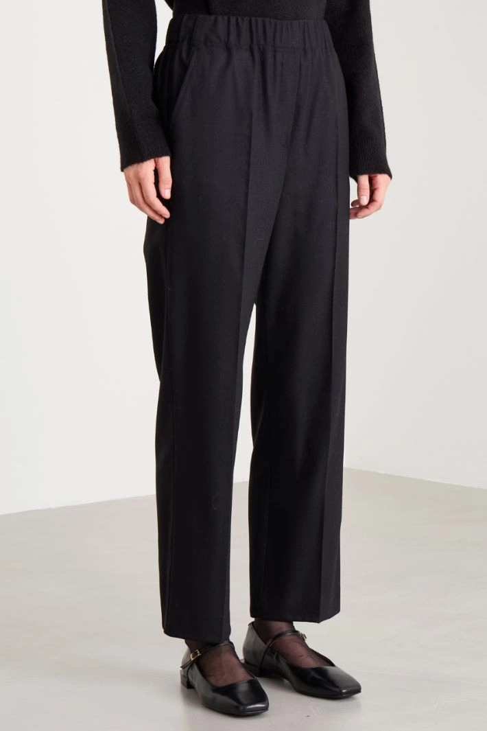 Straight-fit trousers in stretch wool flannel with an elastic waistband, slant pockets at the front, and patch pockets with flaps and buttons at the back. Fake fastening and pressed crease at the front.