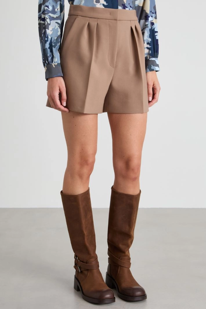 Straight-cut shorts in stretch wool canvas, with topstitching, double pleats at the waist, side French pockets and hidden fastening with zip, button and hooks.