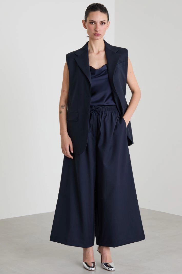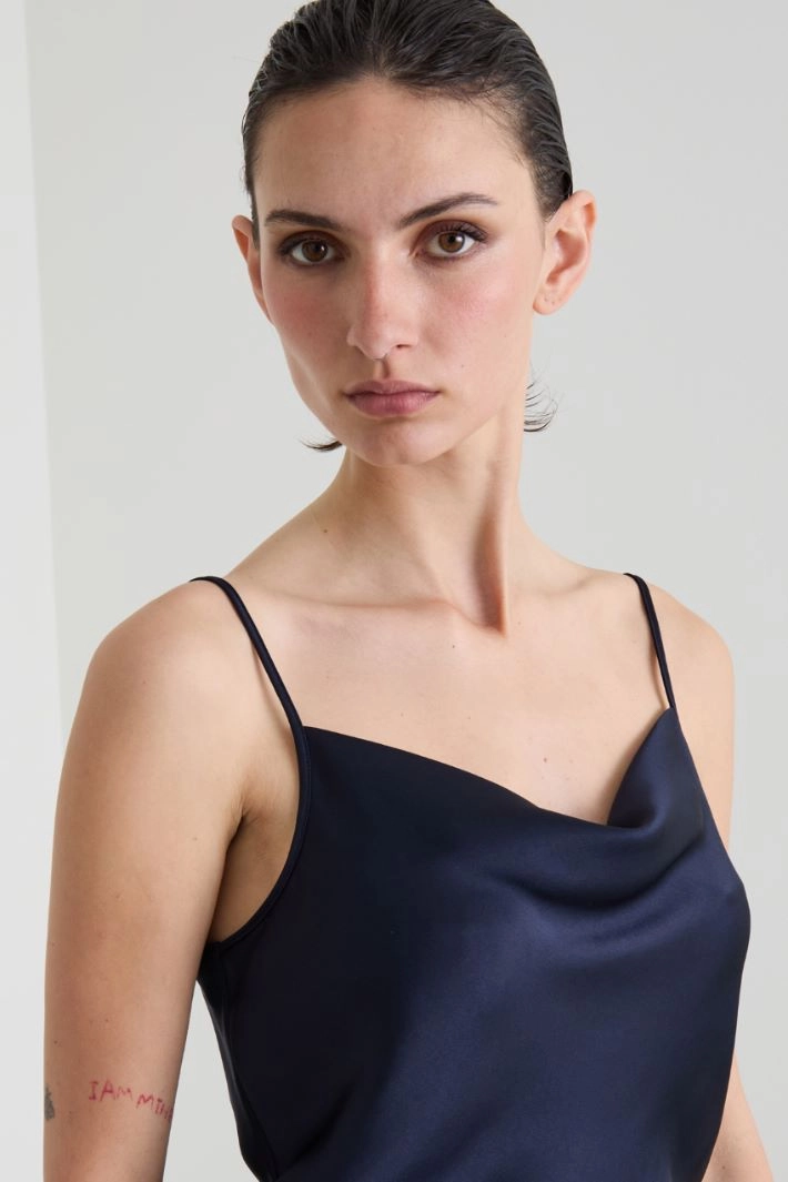 Slip top in envers satin with a shiny finish featuring a draped neckline and thin shoulder straps.