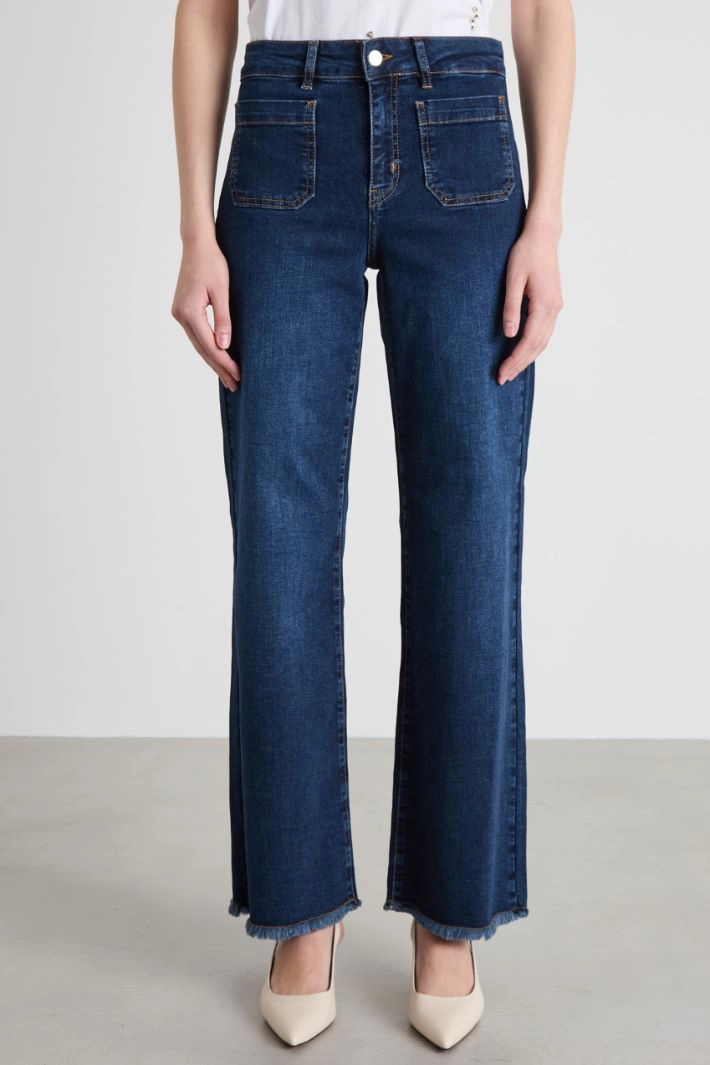 Straight-fit jeans in stretch cotton denim, with belt loops and patch pockets on the front and back. Frayed hem. Concealed zip and button fastening.