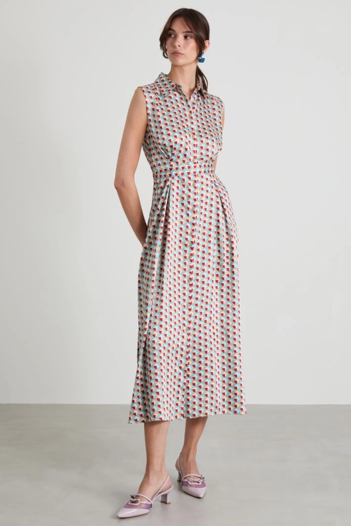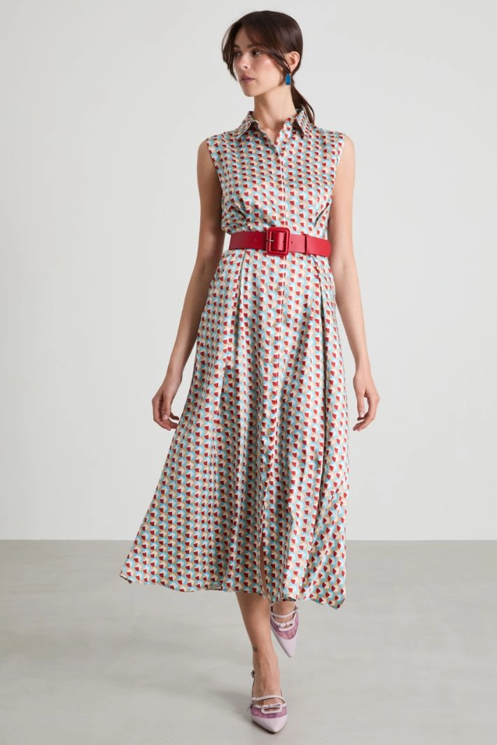 A-line shirt dress in printed twill, with a shirt collar, a pleat motif on the chest and waist, and side slits at the bottom of the garment. Matching belt. Button fastening.