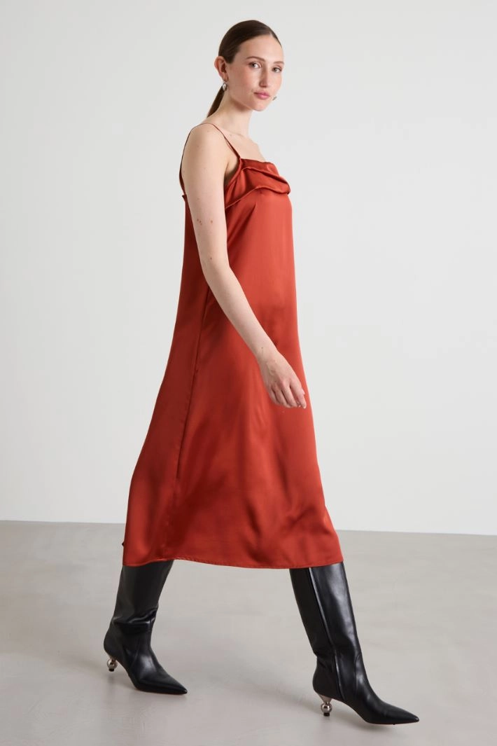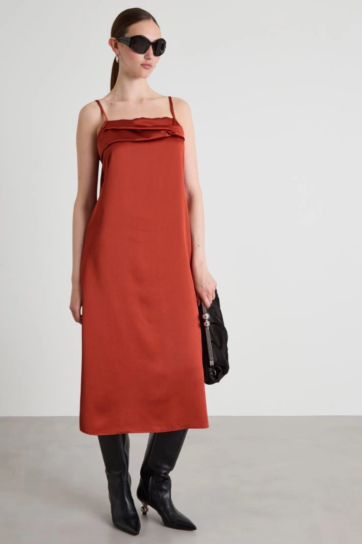 Satin slip dress with a straight neckline and draped motif on the front, thin shoulder straps and a central slit at the back.