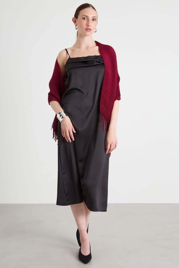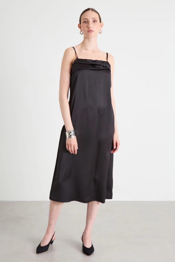 Satin slip dress with a straight neckline and draped motif on the front, thin shoulder straps and a central slit at the back.