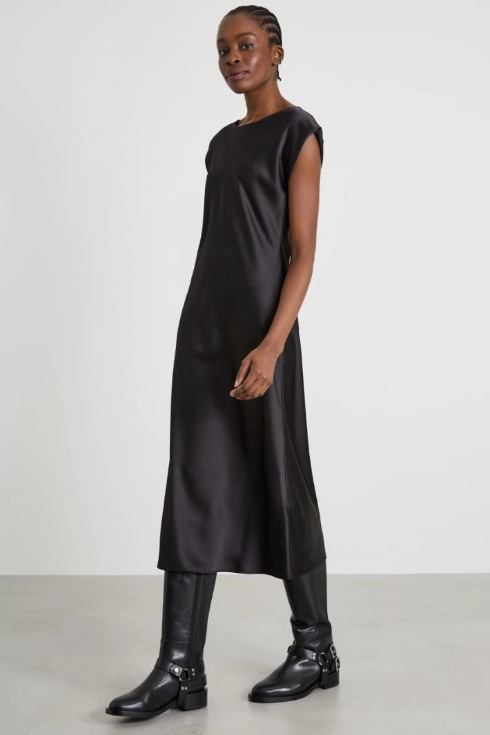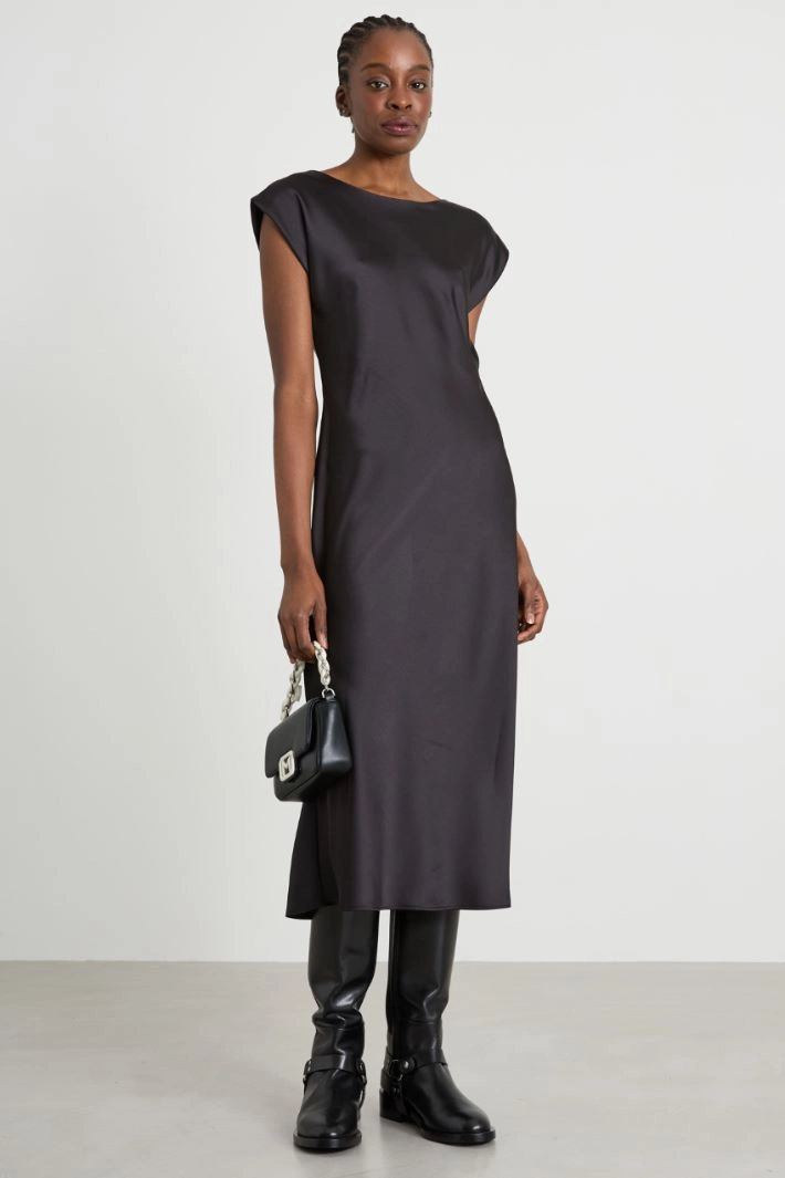 Loose-fit satin dress with a boat neckline on the front and a V-neck on the back, short sleeves with covered shoulders. Partially lined.