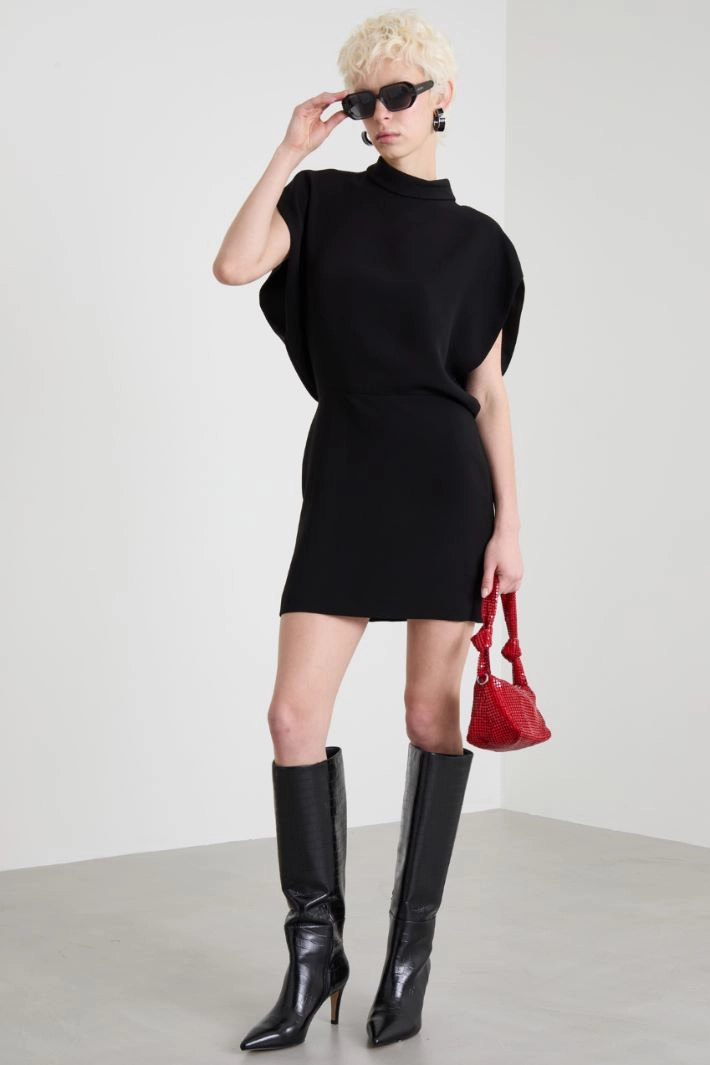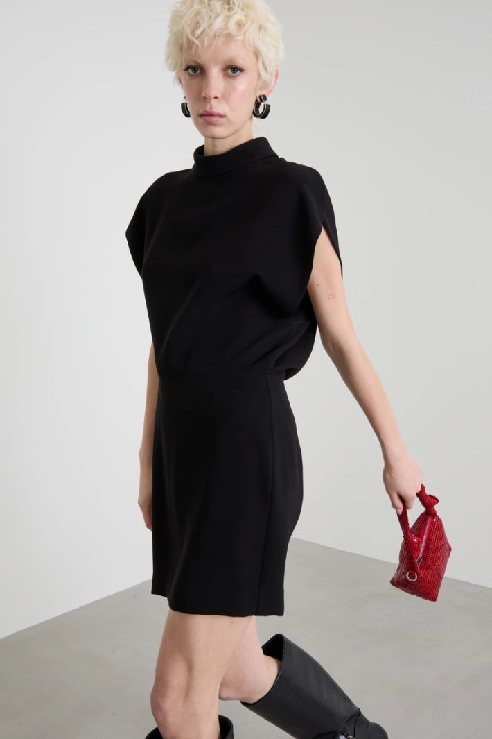 Sheath cady dress with a high collar, short cap sleeves and fastening with an invisible zip and a teardrop with hooks on the back. Lined.