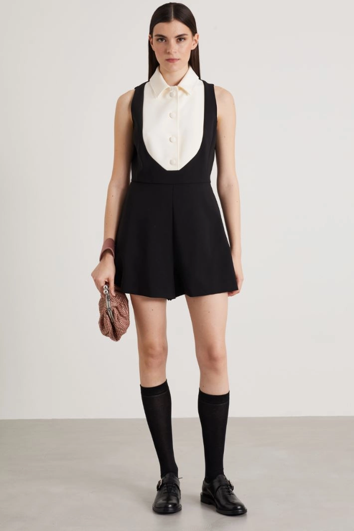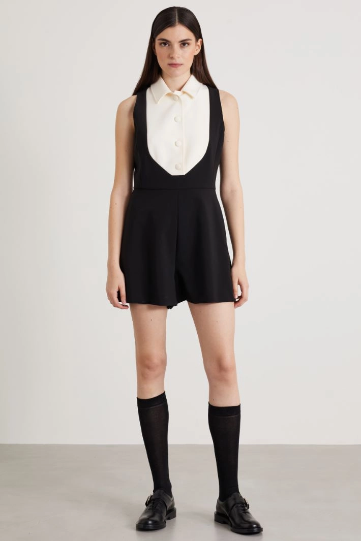 Flared jumpsuit in stretch cady, with shirt collar, contrasting plastron on the front with a tuxedo effect and pockets inserted in the seams on the sides. Button fastening. Semi-lined garment.