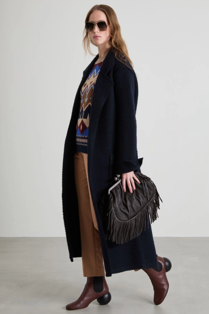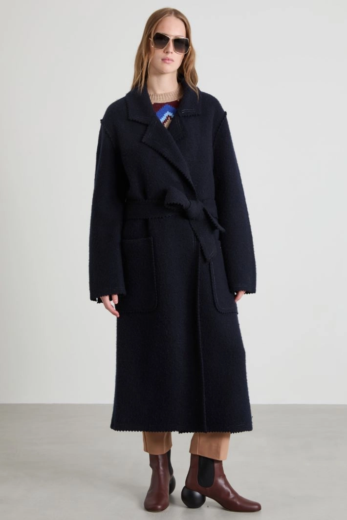 Long, loose fit coat in wool and cashmere felt-effect jersey, with contrasting stitching, lapel collar, long sleeves and side pockets. Central slit on the back and zigzag profiles. Belt fastening. Unlined.