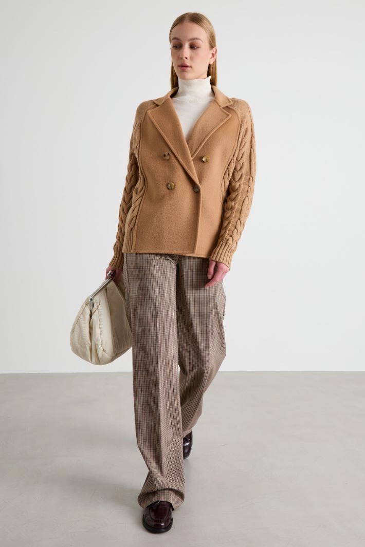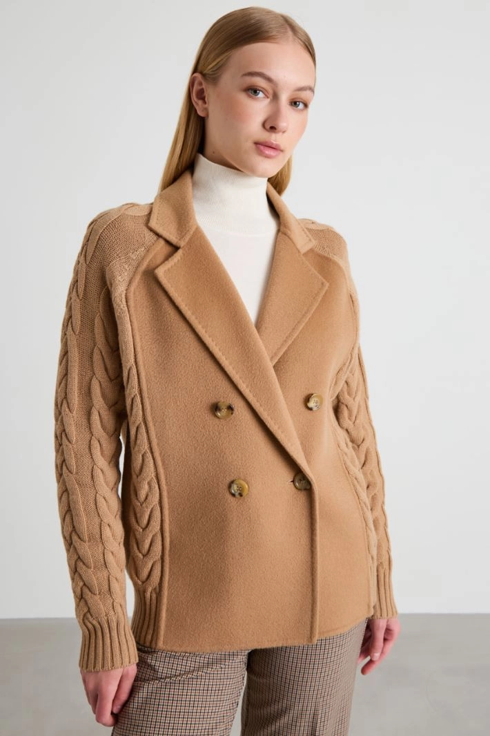 Straight-fit pea coat in double wool and cashmere drap, with cable knit inserts on the sleeves and back, matching dot trim, lapel collar and long raglan sleeves. Double-breasted button fastening. Unlined.