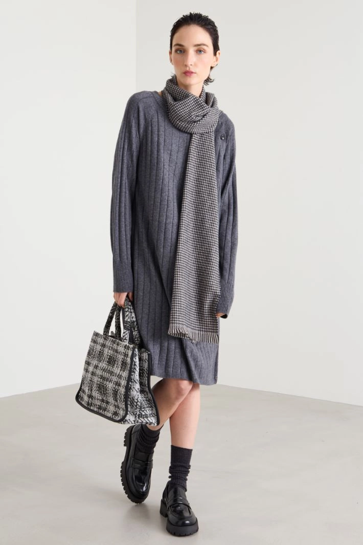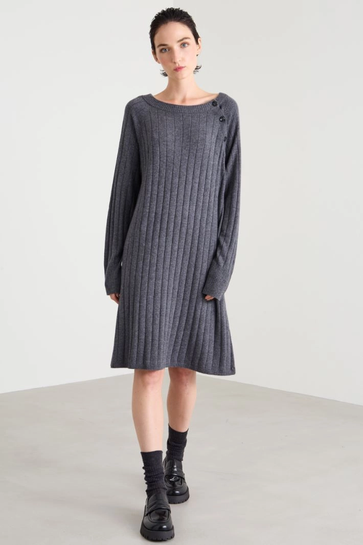 Flared dress in wool and viscose blend knit, with flat ribbed knit, boat neckline and long raglan sleeves with button detail.