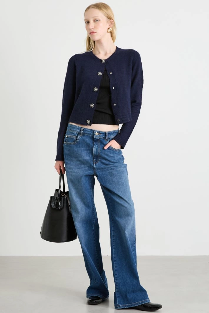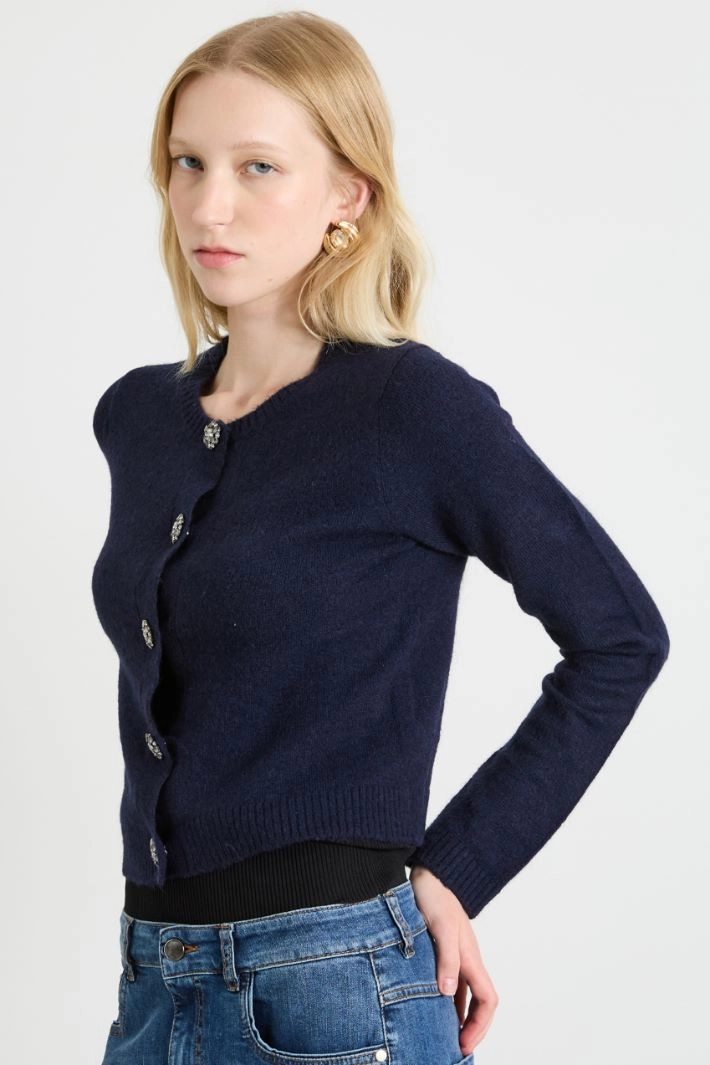 Straight-cut cardigan in stretch wool and alpaca blend yarn, with crew neck, long sleeves and ribbed trim. Fastened with jewel buttons.