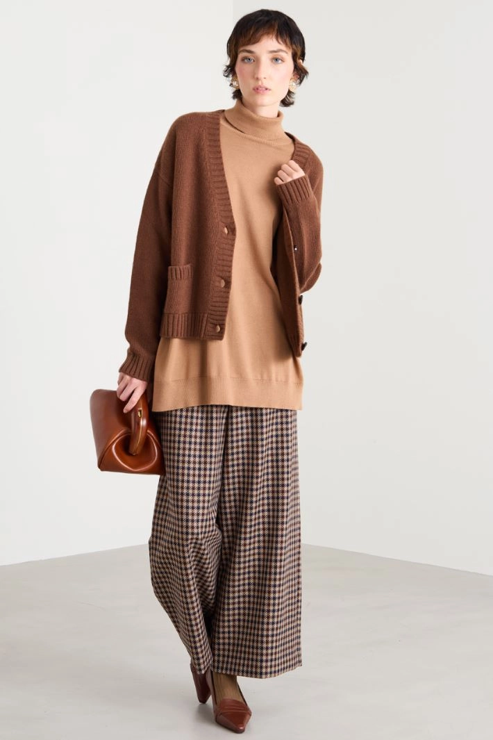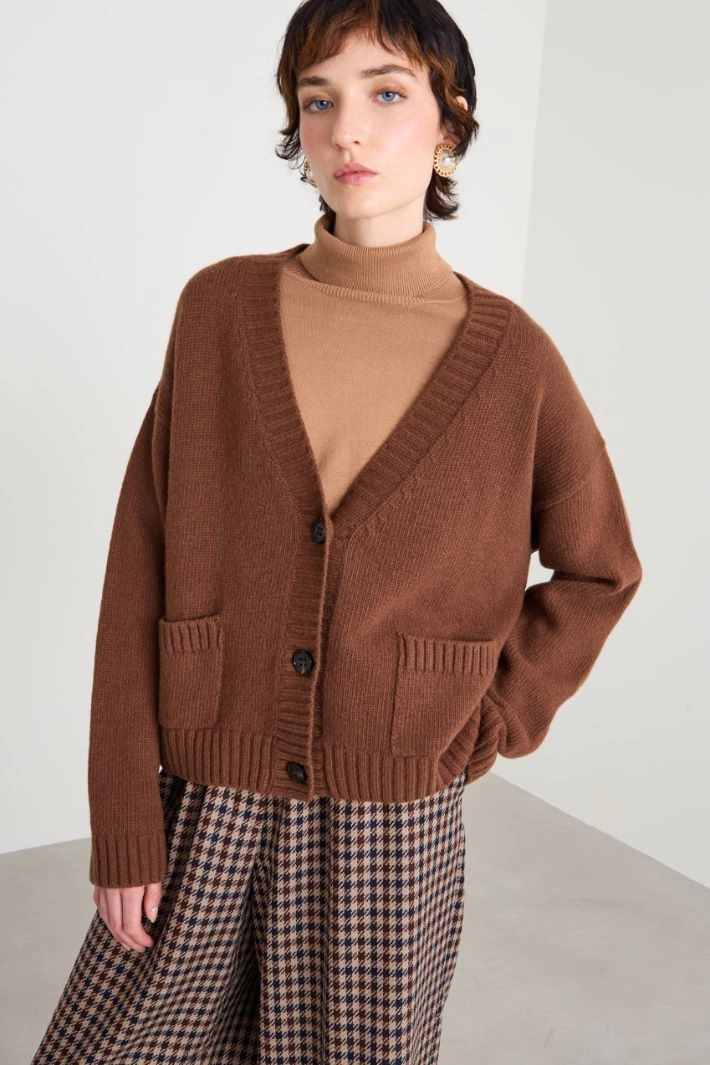 Straight-cut cardigan in pure wool yarn, with a V-neck, long dropped sleeves, patch pockets and ribbed trim. Fastening with visible buttons.