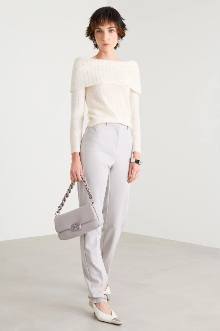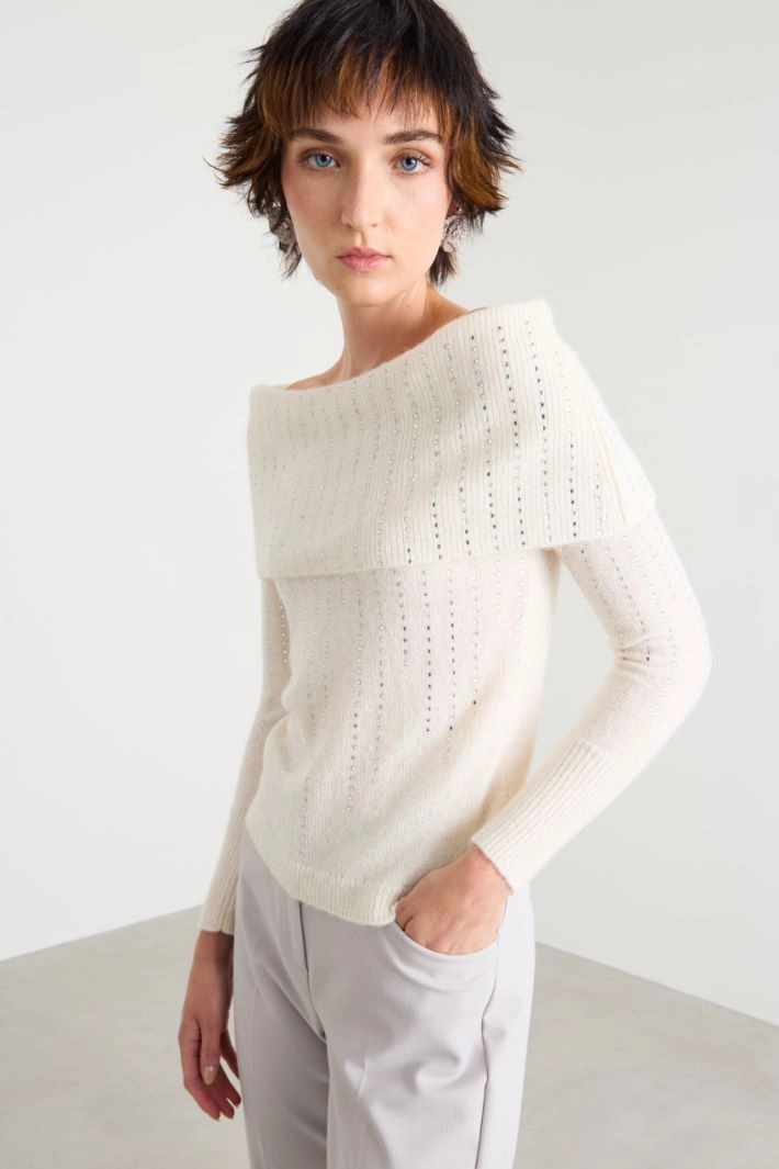 Semi-fitted sweater in wool blend yarn, with rhinestones applied on the front, collar with wide ring lapel and long sleeves.