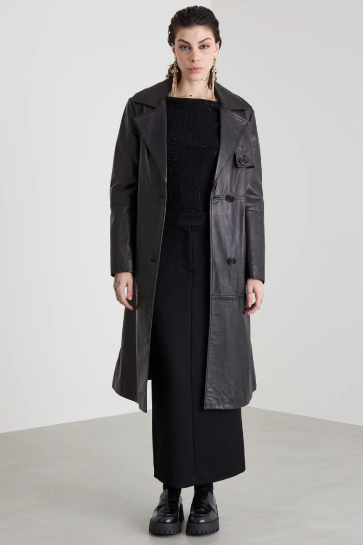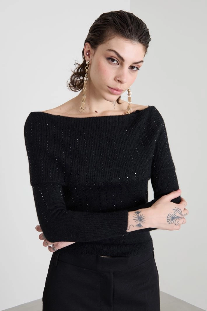Semi-fitted sweater in wool blend yarn, with rhinestones applied on the front, collar with wide ring lapel and long sleeves.