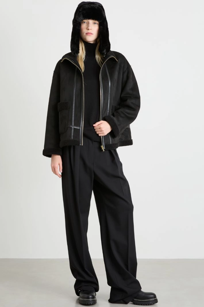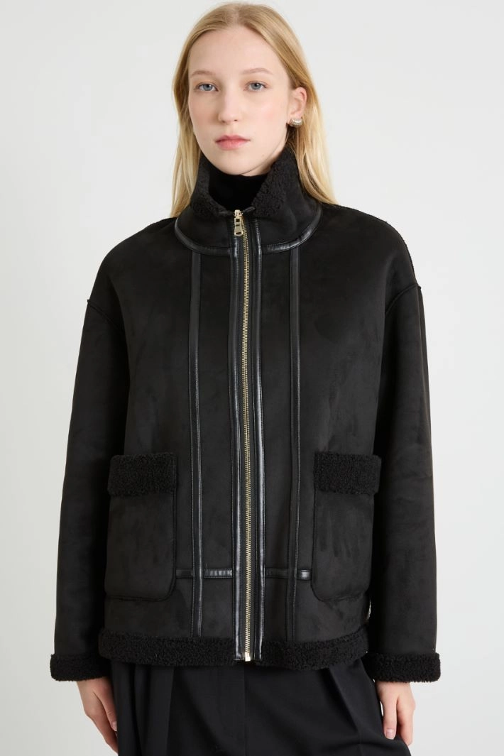 Straight-fit faux sheepskin jacket with a high collar, long dropped sleeves, side patch pockets and single-breasted zip fastening. Reversible model with plush interior.