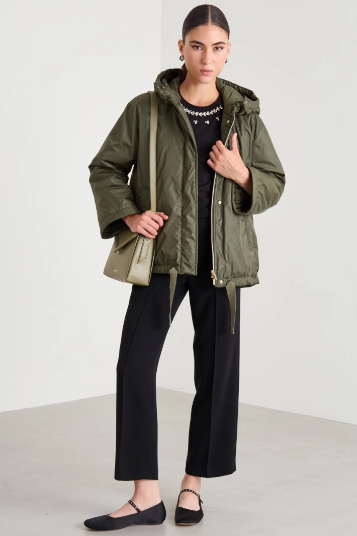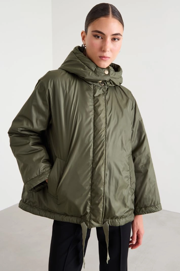 Flared padded jacket in water-resistant technical satin, with hood, long sleeves, side welt pockets, adjustable drawstring at the bottom of the garment and asymmetric hem. Hidden fastening with double-slider zip and buttons.