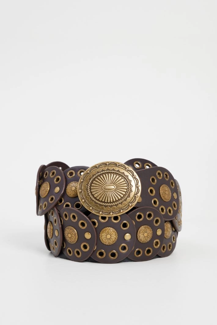 Belt in faux leather circles with metal details and fastening with an interlocking buckle.