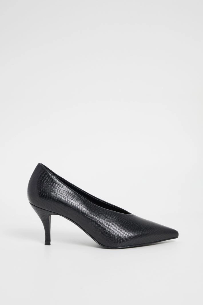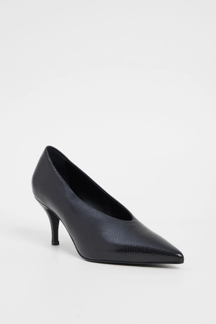 Pumps in genuine crocodile-print leather, with pointed toe and tapered neckline. Leather lining and rubber sole.