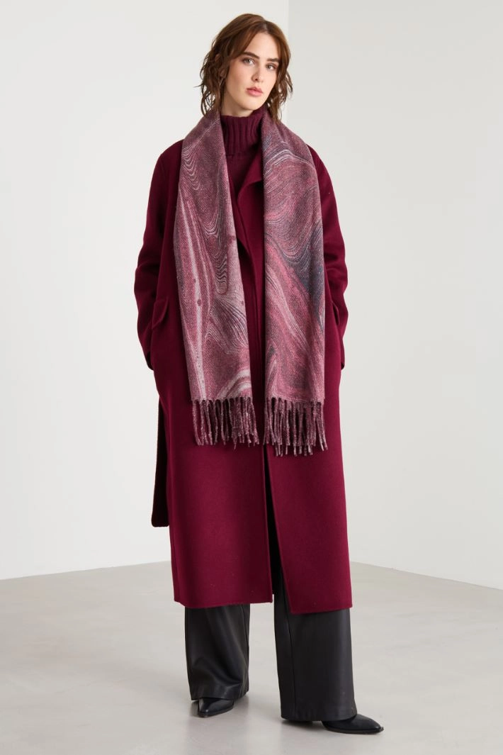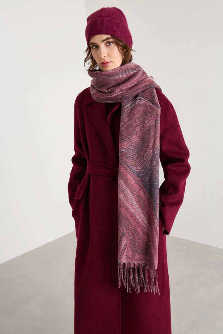 Scarf in patterned yarn, with lamé fibre insert and fringes at the bottom.