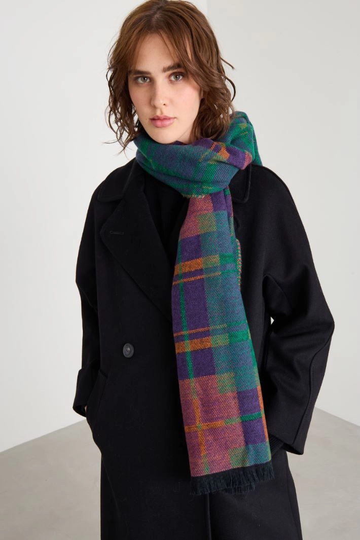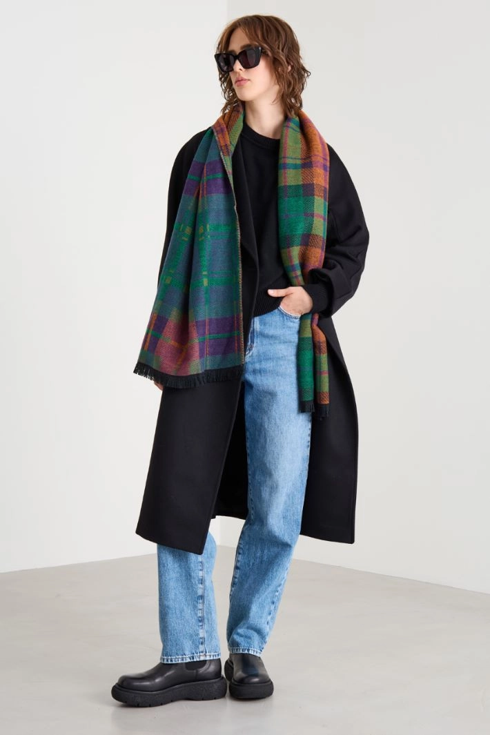 Stole in soft yarn-dyed fabric. Frayed edges.