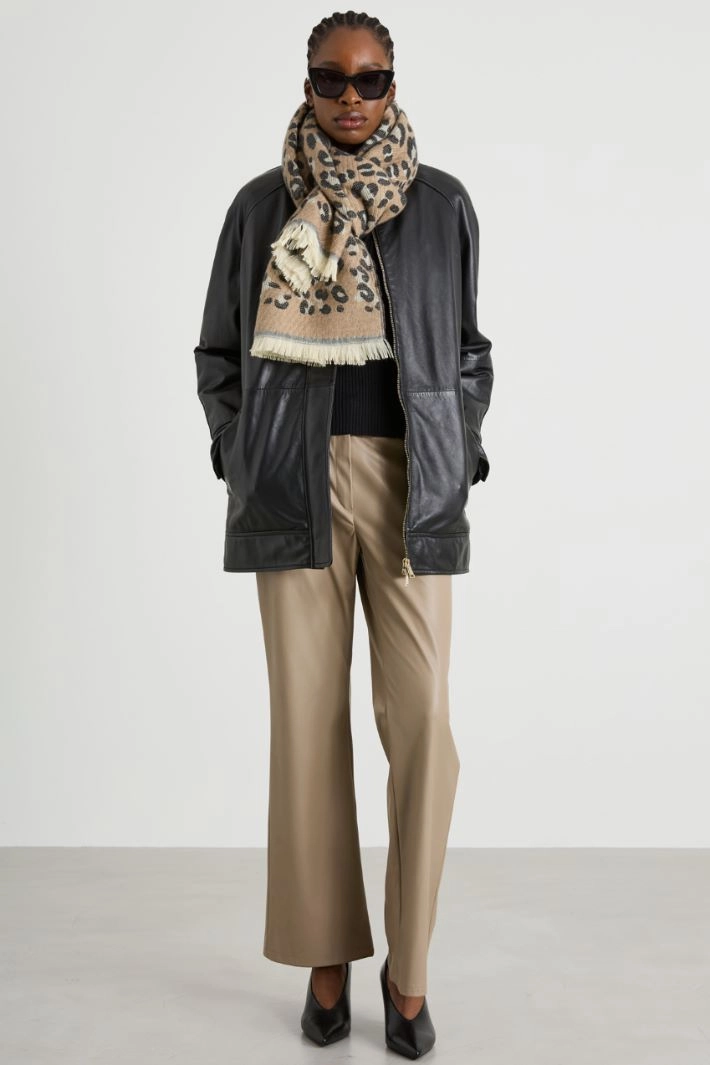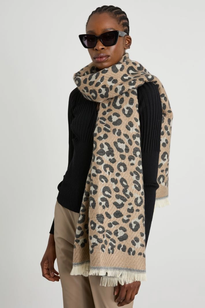 Stole in knitted jacquard with animal print and frayed edges.